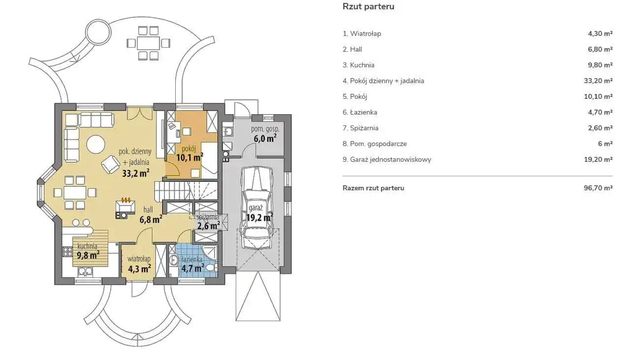 strefę dzienną (parter): salon z jadalnią i wyjściem na taras, kuchnię, pokój, wiatrołap, hol z garderobą, łazienkę z WC, spiżarnię oraz pomieszczenie gospodarcze.