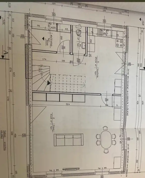- Przestronny salon 42 m2 z możliwością wkomponowania kominka