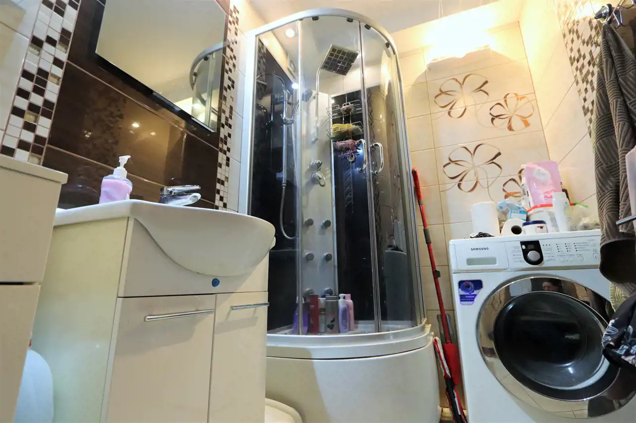 Łazienka wyposażona w kabinę prysznicową i pralkę
