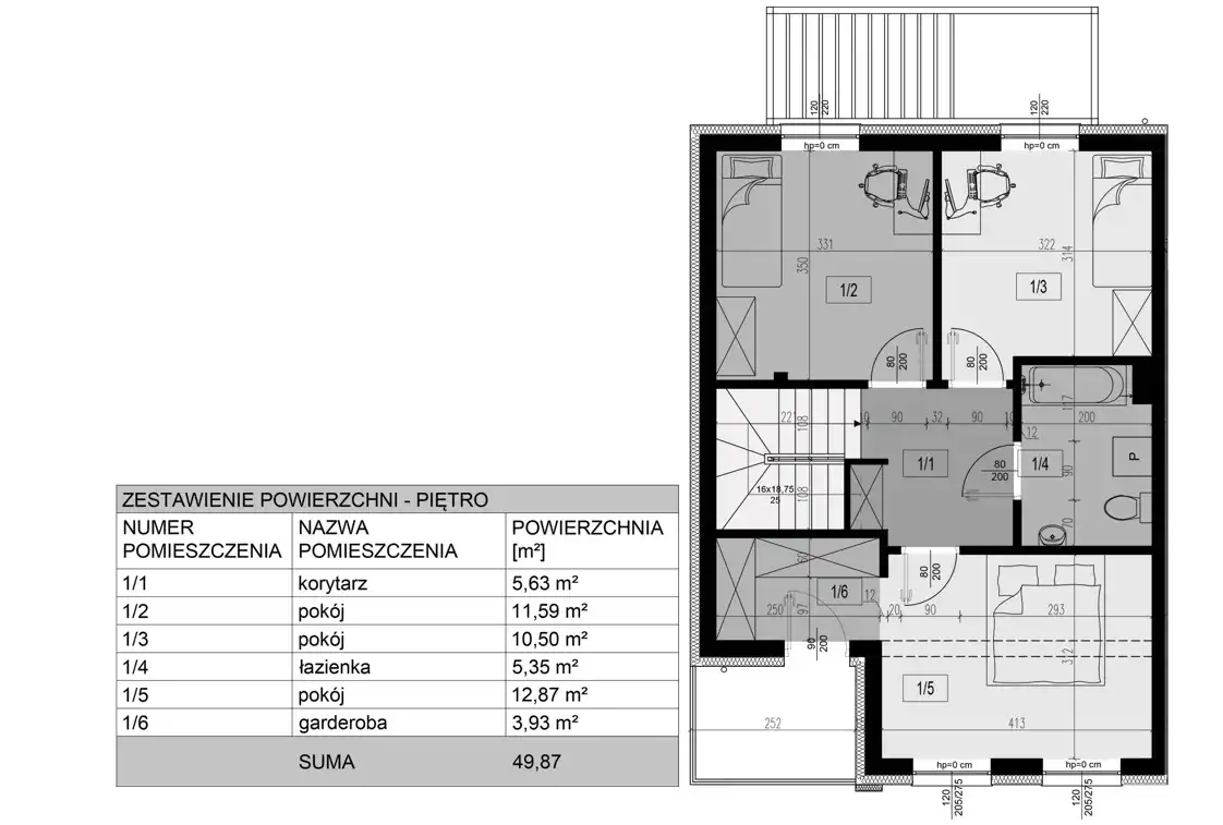 - Balkon: płyta betonowa o grubości 20 cm z mostkami termicznymi (10 cm), wykończona płytkami gresowymi.