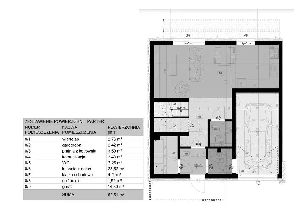 - Mury: 25 cm beton komórkowy, ocieplony styropianem o grubości 15 cm, a na zewnątrz elegancka elewacja.