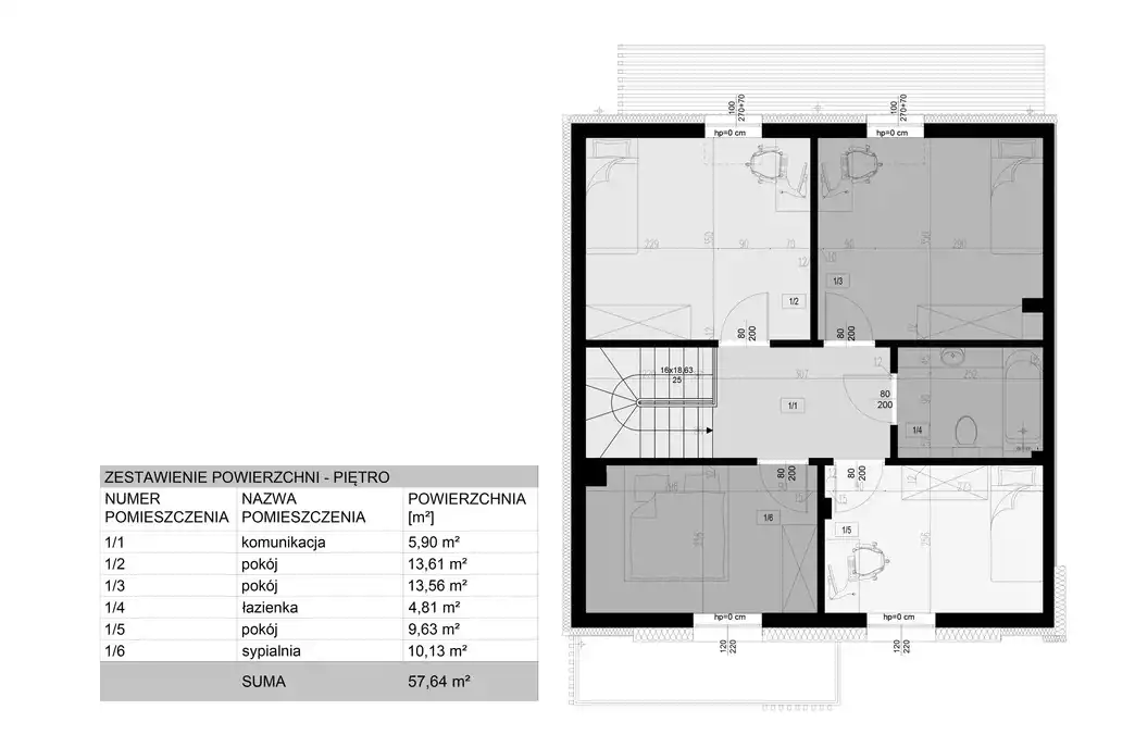 - Balkon: płyta betonowa o grubości 20 cm z mostkami termicznymi (10 cm), wykończona płytkami gresowymi.