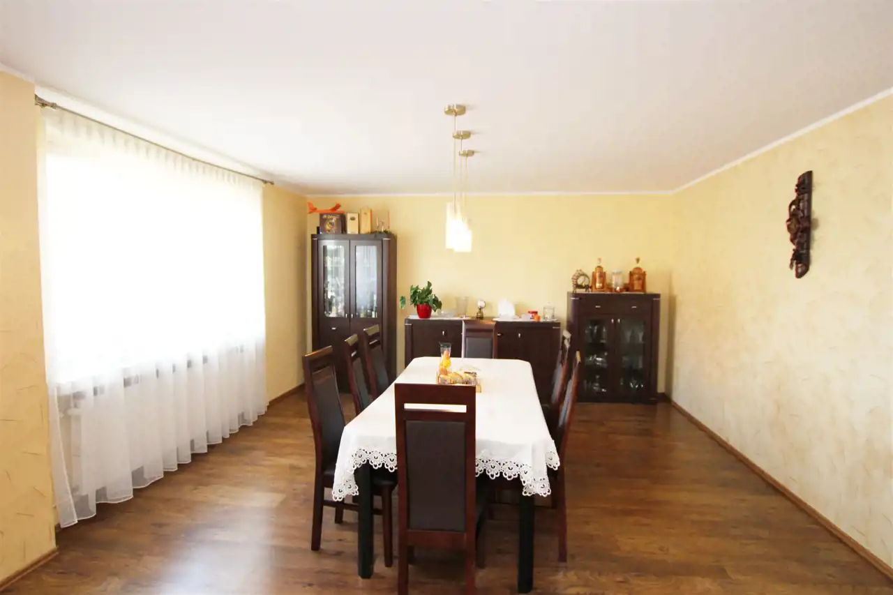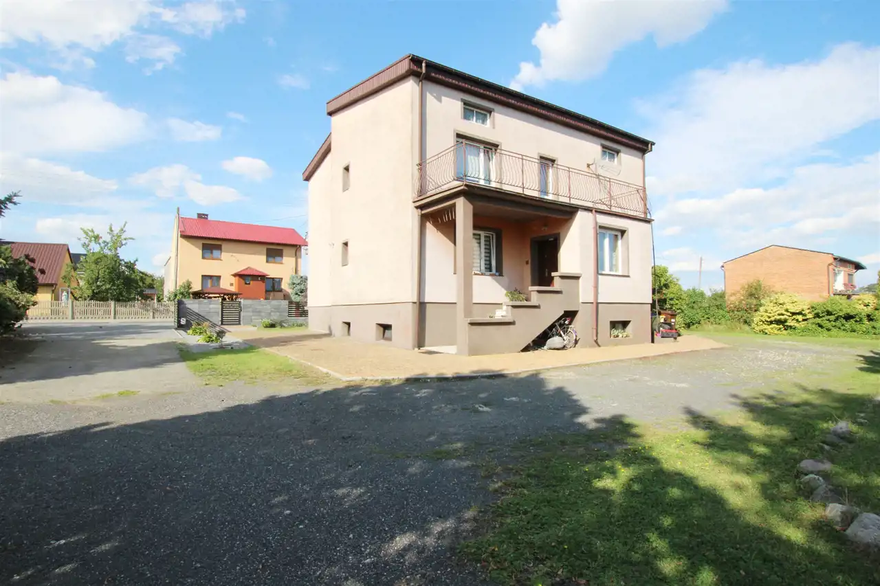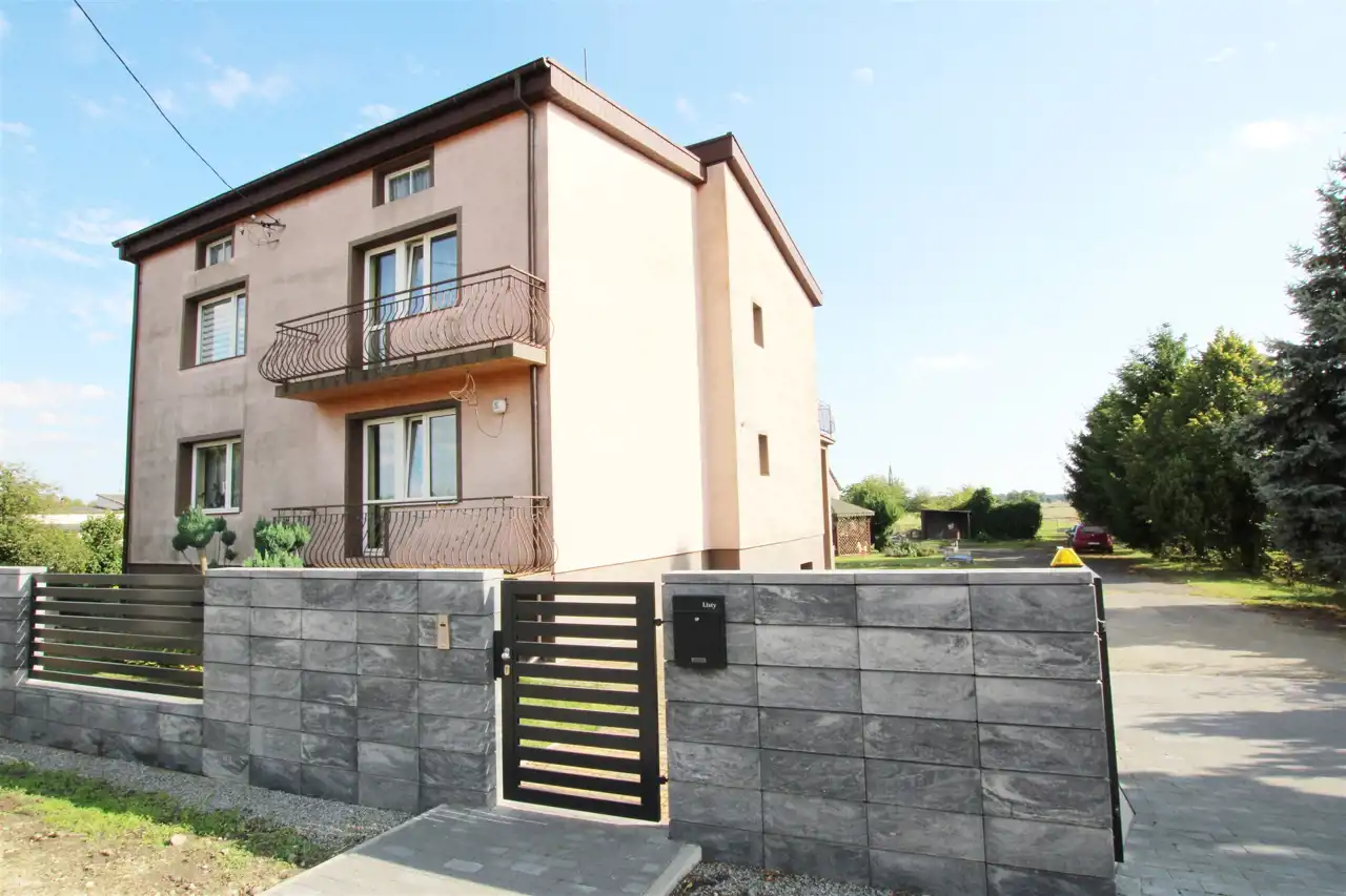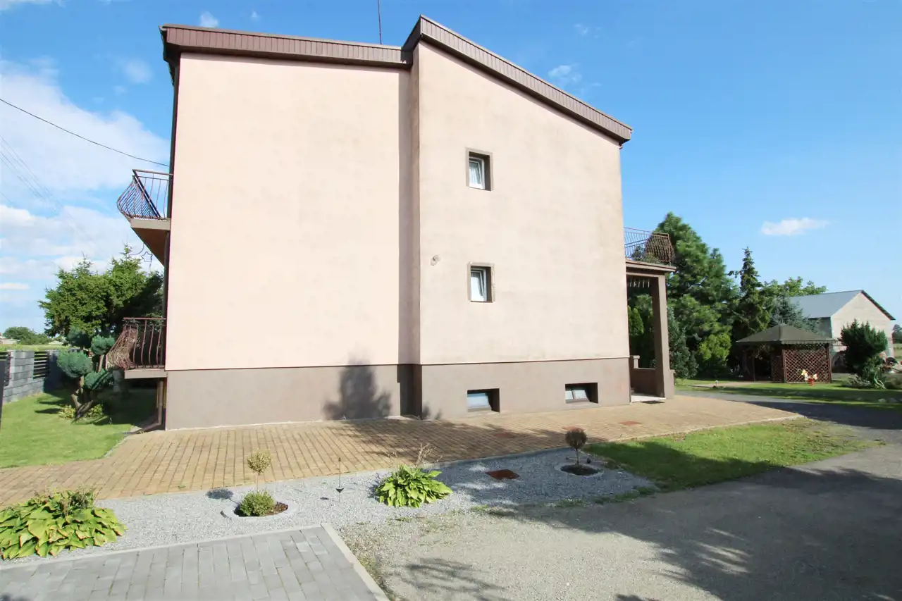 Budynek mieszkalny posiada powierzchnię użytkową około 180 m2 i składa się z piwnicy z garażem, parteru, piętra oraz poddasza. Wnętrze budynku utrzymane w stanie bardzo dobrym - na podłodze znajduje się terakota i panele, ściany w gładzi gipsowej i zabudowie G/K, pomalowane. Instalacja energetyczna jedno i trój- fazowa w budynku mieszkalnym oraz gospodarczym, instalacja wodno- kanalizacyjna miejska, sieć gazowa doprowadzona do budynku.