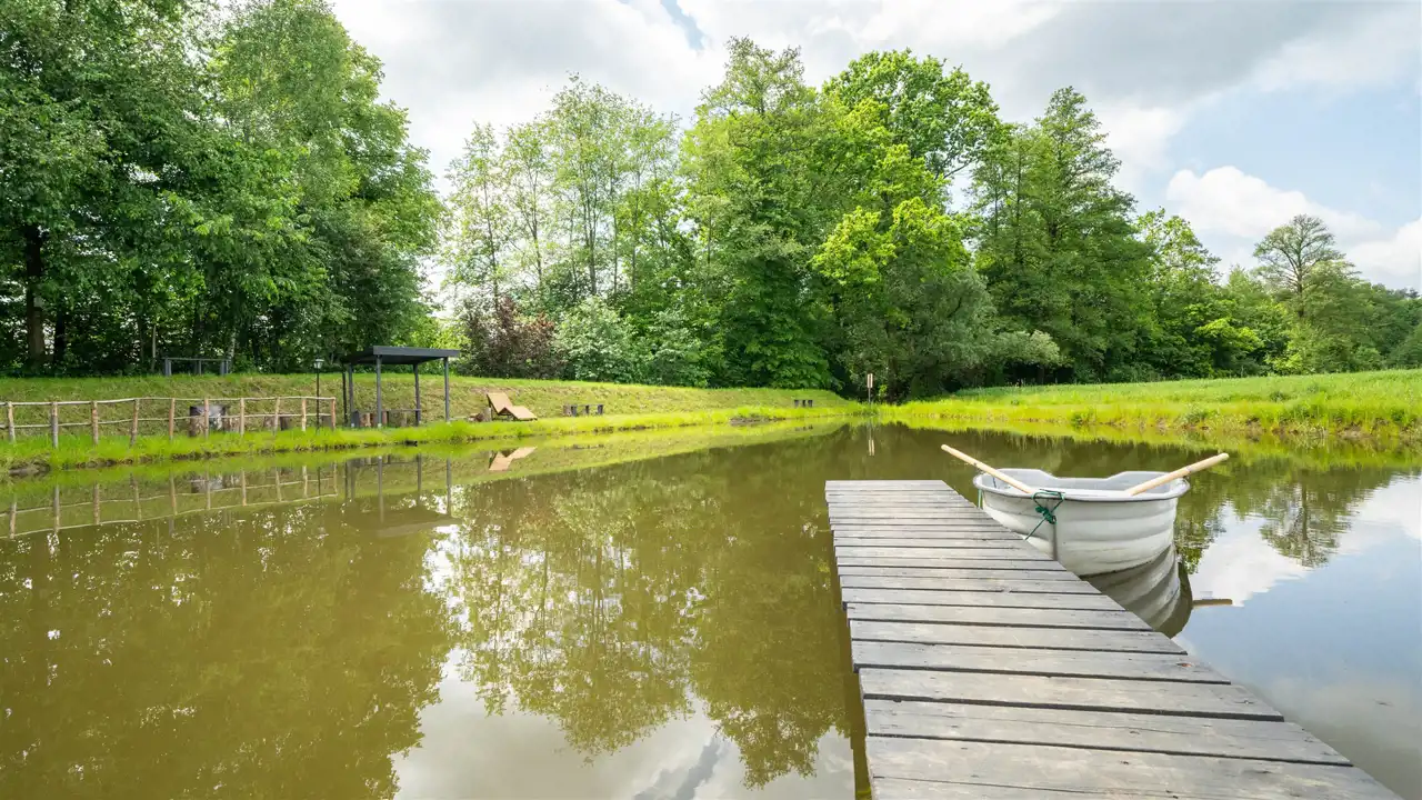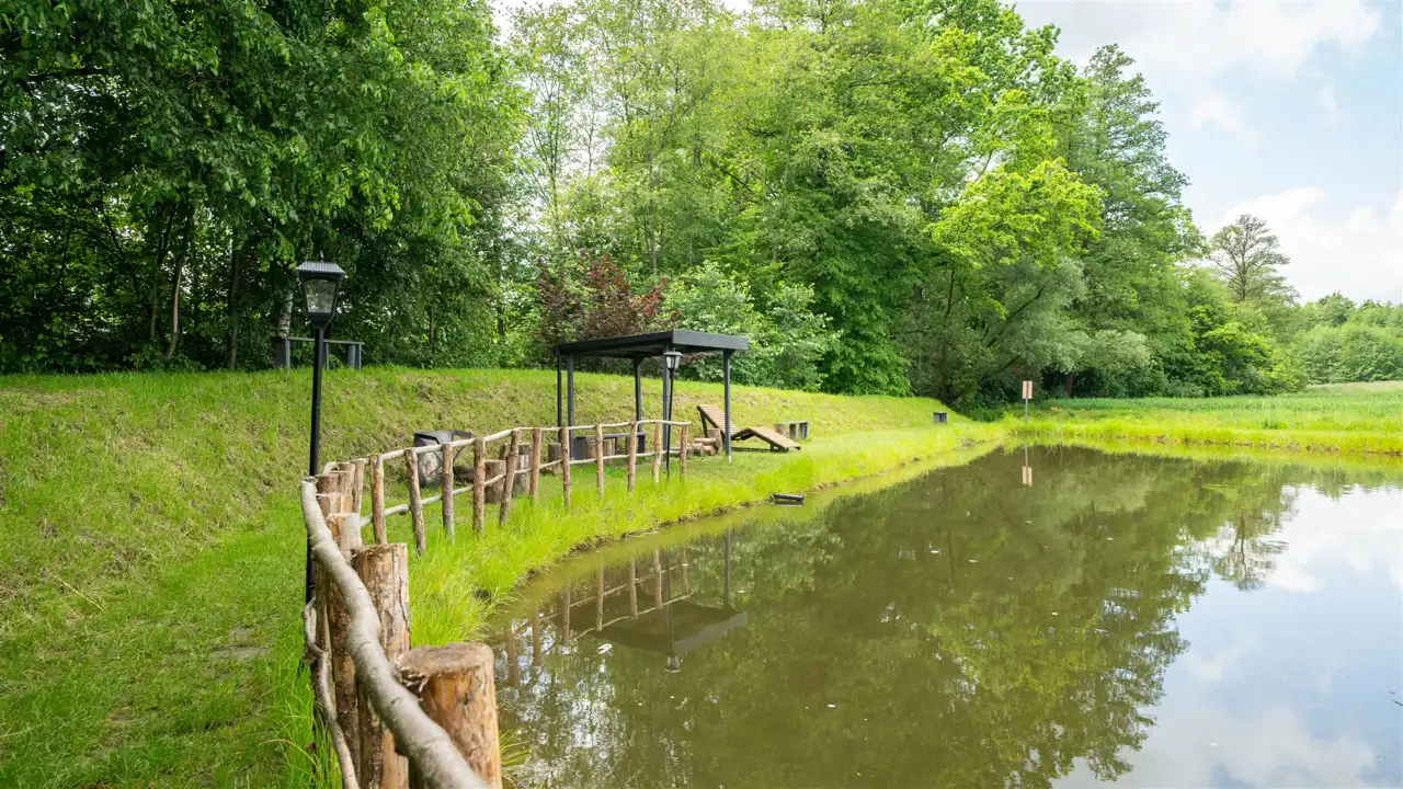 Przestronny salon (16,10 m²) z aneksem kuchennym (11,25 m²) i wyjściem na duży taras z malowniczym widokiem na staw,