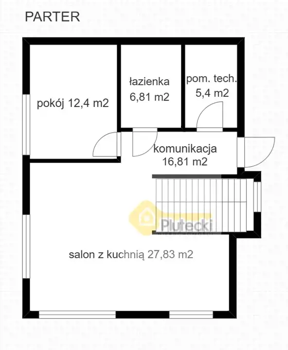 - Parter: jasny salon z aneksem kuchennym, sypialnia/gabinet, łazienka, pomieszczenie gospodarcze