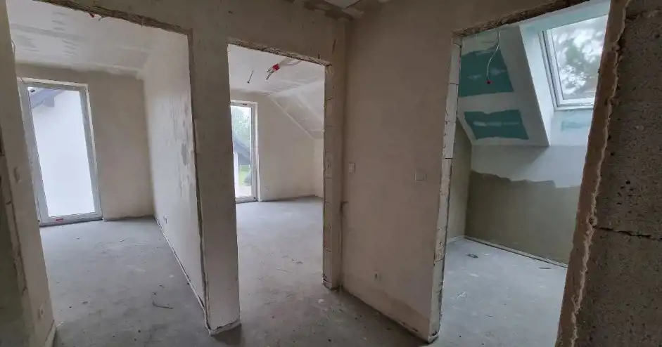 - Tynki: gipsowe w pozostałej części domu, cementowo-wapienne w łazienkach