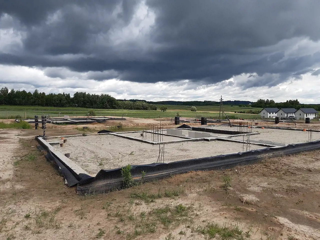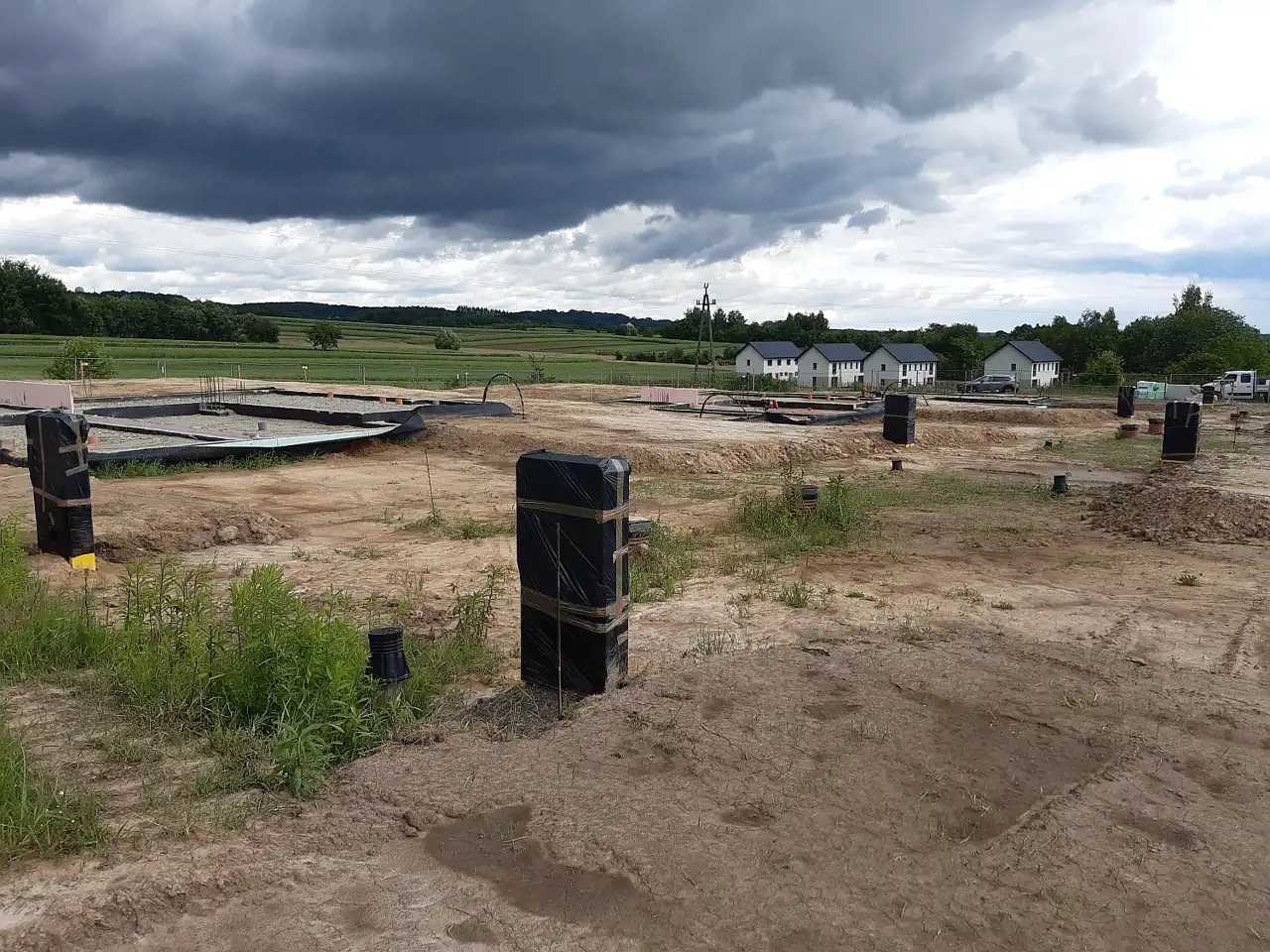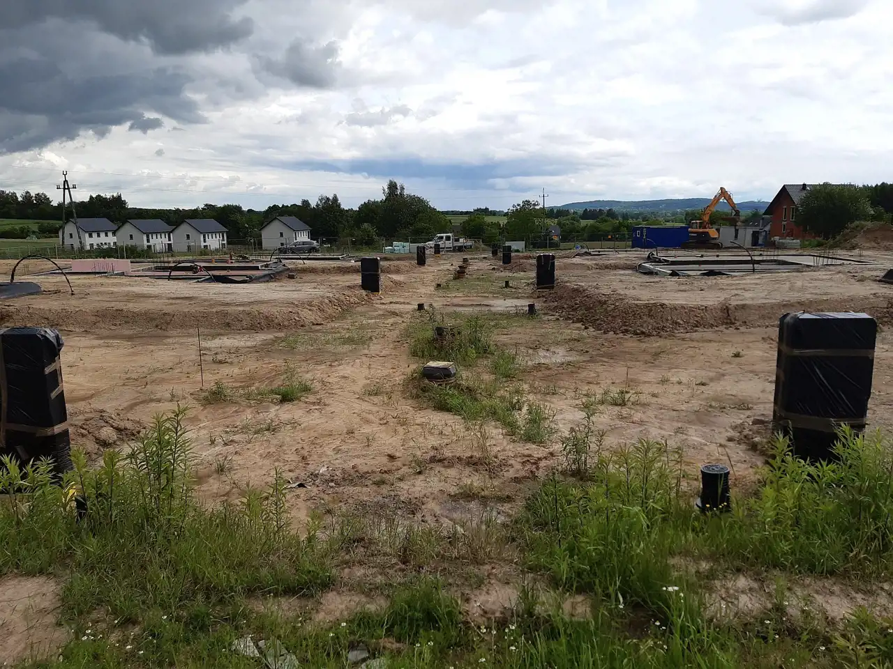 Działka z wylanymi fundamentami uzbrojona z rozprowadzoną siecią pod każdy dom (wodno-kanalizacyjną, prąd, gaz, światłowód).