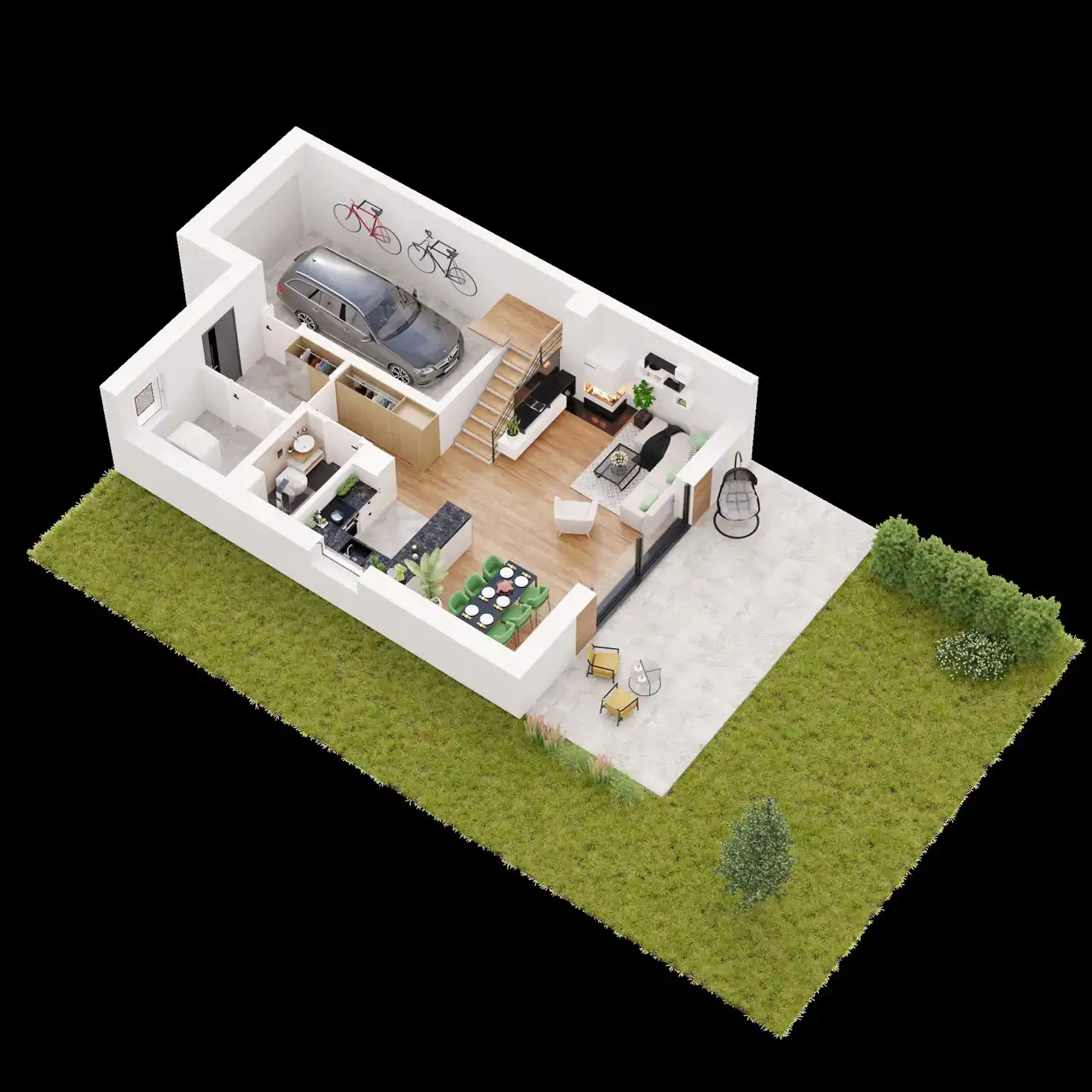 Parter: wiatrołap (3,91m2), garaż (17,95m2), hol (4,73m2), schody (5,17m2), salon (24,63m2), kuchnia (5,88m2), łazienka (3,04m2) kotłownia (4,09m2) - razem 69,4m2
