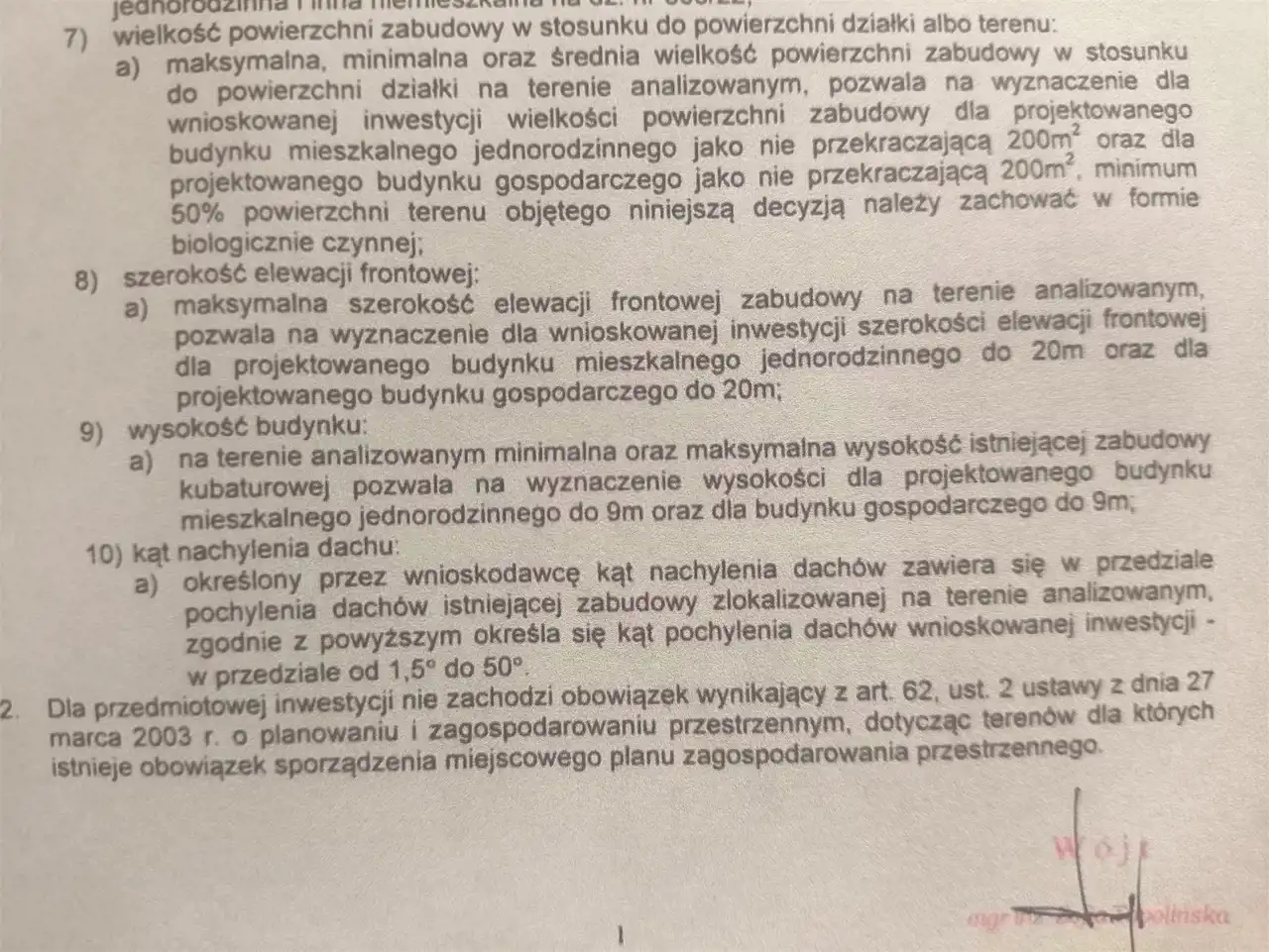 Działka o powierzchni 3080 m² posiada aktualne warunki zabudowy pod dom mieszkalny oraz budynek gospodarczy (pow. zabudowy domu do 200m2 oraz budynek gospodarczy również do max.200m2 zabudowy, kąt pochylenia dachu od 1,5 do 50 stopnia, wysokość budynków do 9 m. Wymiary działki to ok.24,5 m x 127 m.