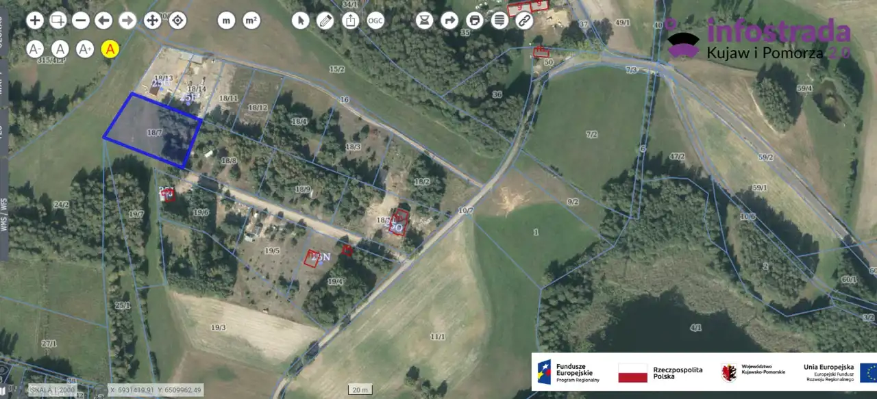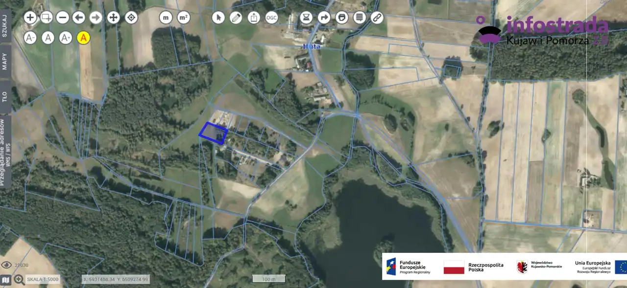 Działka położona w otoczeniu łąk i lasu. W prostej linii do jeziora ok 350 m, do plaży 1,5 km.