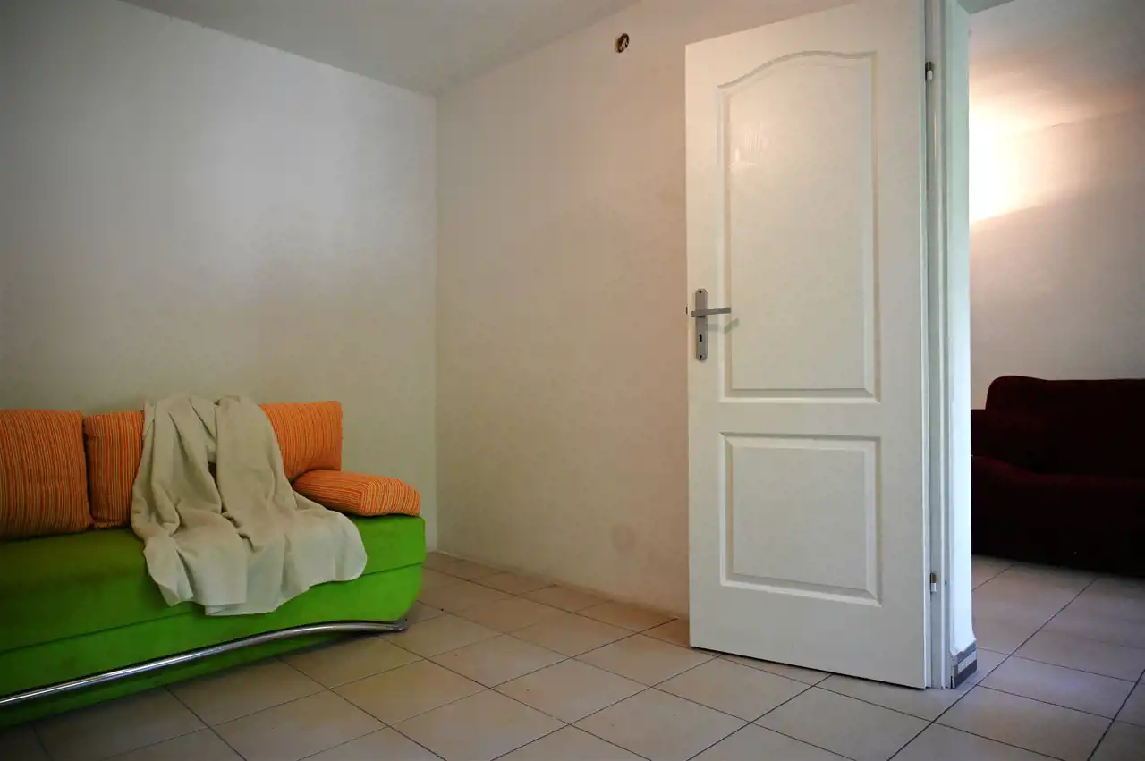 Sypialnia powierzchni 10,73m2 , na podłodze kafle a ściany malowane. pozostaje rozkładana kanapa.