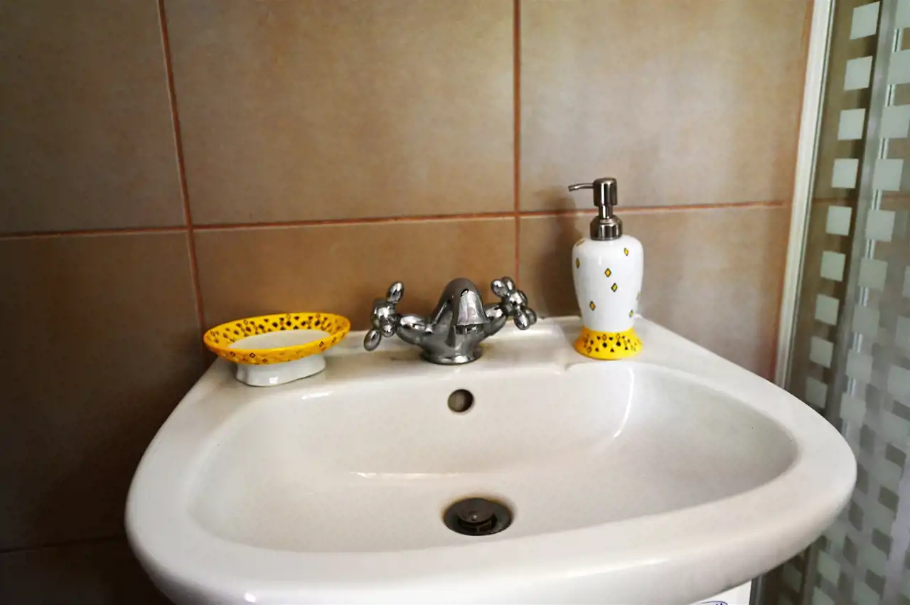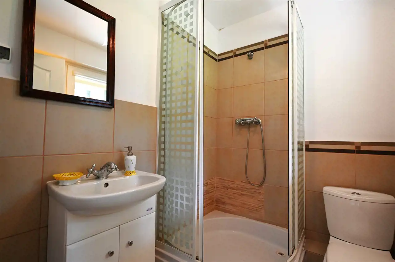 Łazienka z kabiną natryskową w kaflach, ogrzewanie podłogowe elektryczne.