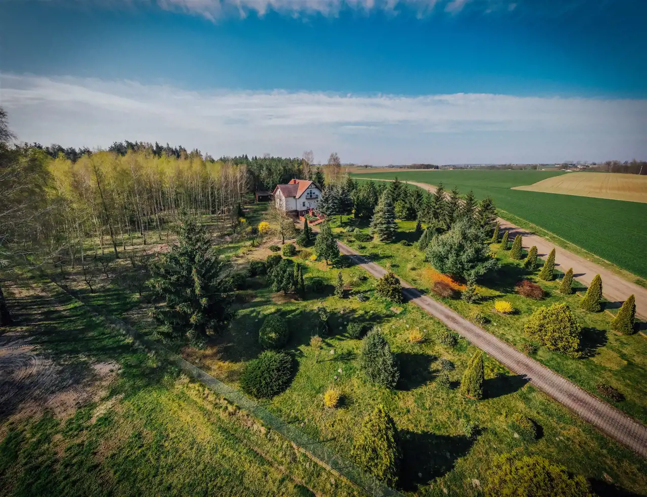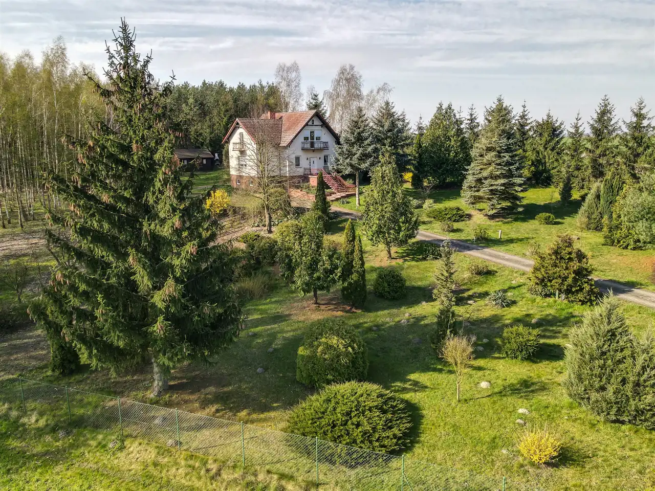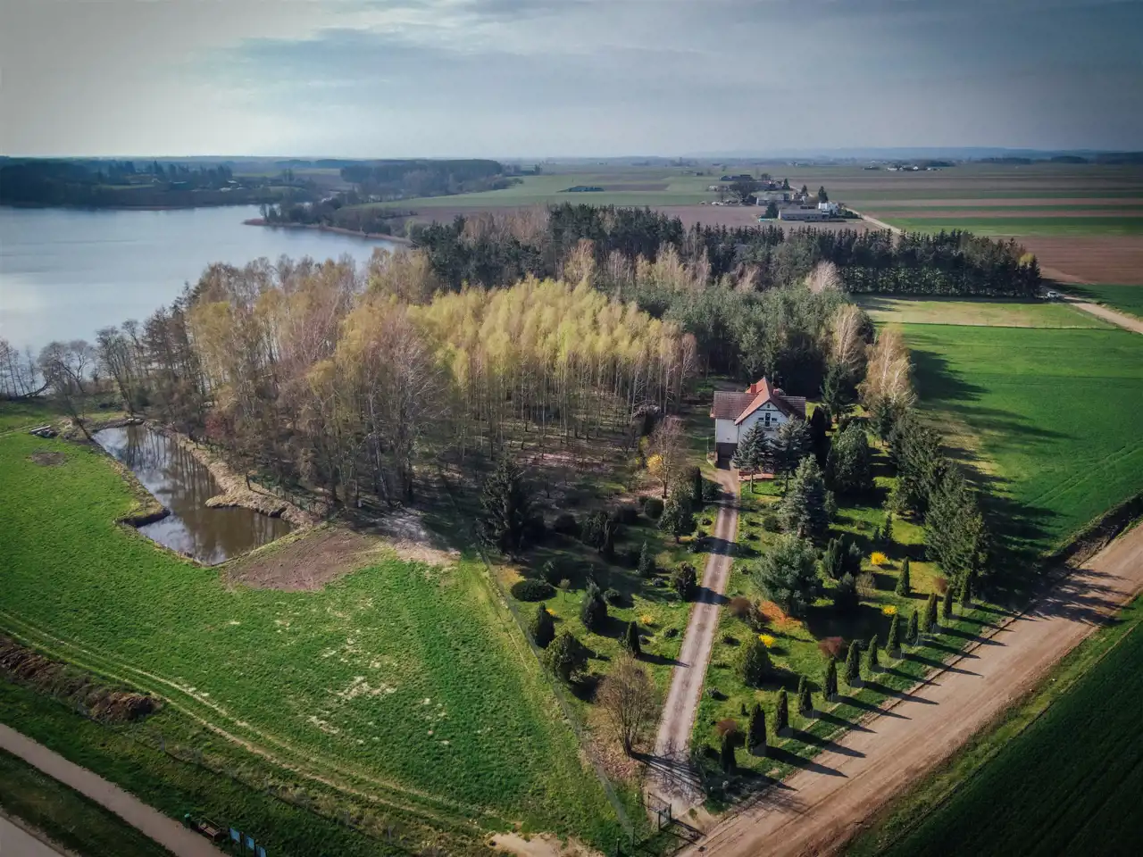 Na posesję wjeżdżamy zdalnie sterowaną bramą, pokonując długi podjazd wzdłuż którego zainstalowane jest niskie oświetlenie ogrodowe. Cała działka jest ogrodzona i w przeważającej większości porośnięta lasem w którym dominuje sosna,świerk i brzoza. Z brzóz i świerków uformowana została alejka, którą przemieszczając się w dół dochodzimy do jeziora. Zachwyt nad naturalnym pięknem tego miejsca odbiera mowę. To miejsce to raj dla koneserów naturalnego piękna w dodatku zasobnego w leszcze i liny. Ta nieruchomość jest stworzona dla ludzi ceniących sobie obcowanie z naturą a jednocześnie mogących korzystać z dóbr cywilizacji i wszelkich udogodnień. Jest to oferta skierowaną również do osób przedsiębiorczych chcących stworzyć w tym miejscu pensjonat dla ludzi starszych lub przystań agroturystyczną, możliwości jest wiele.
