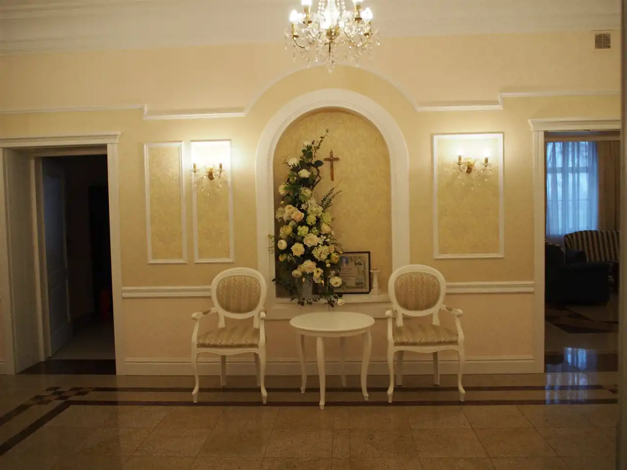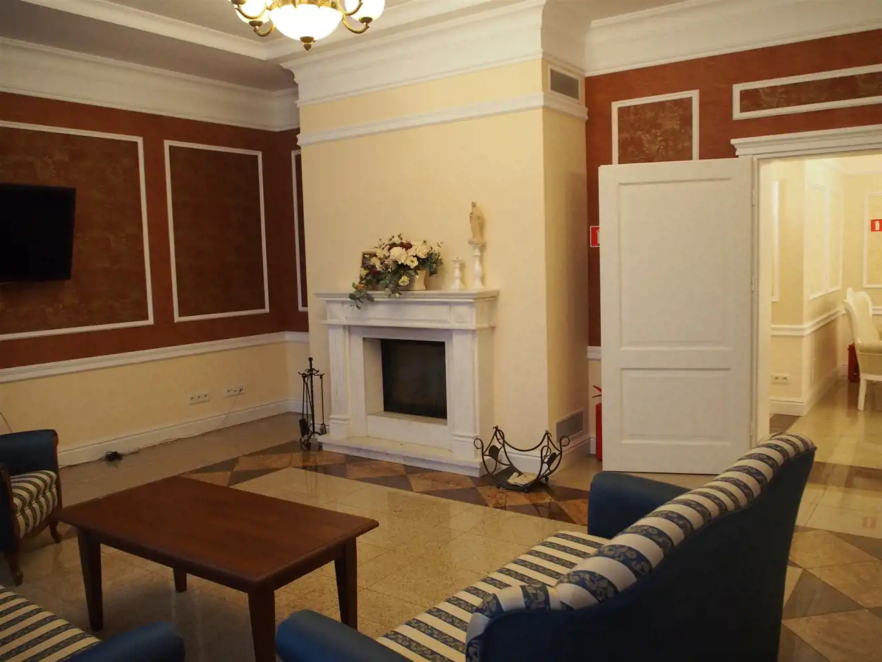 W sali szkoleniowej na parterze wykonano ozdobny kominek, w dwóch salonach na piętrze wykonano ozdobne kominki wolnostojące. Schody na piętro obrobione w gresie, balustrada metalowa kuta. W kuchni wykonano stałą zabudowę. Szafy w stałe zabudowie są wykonane także na korytarzach.