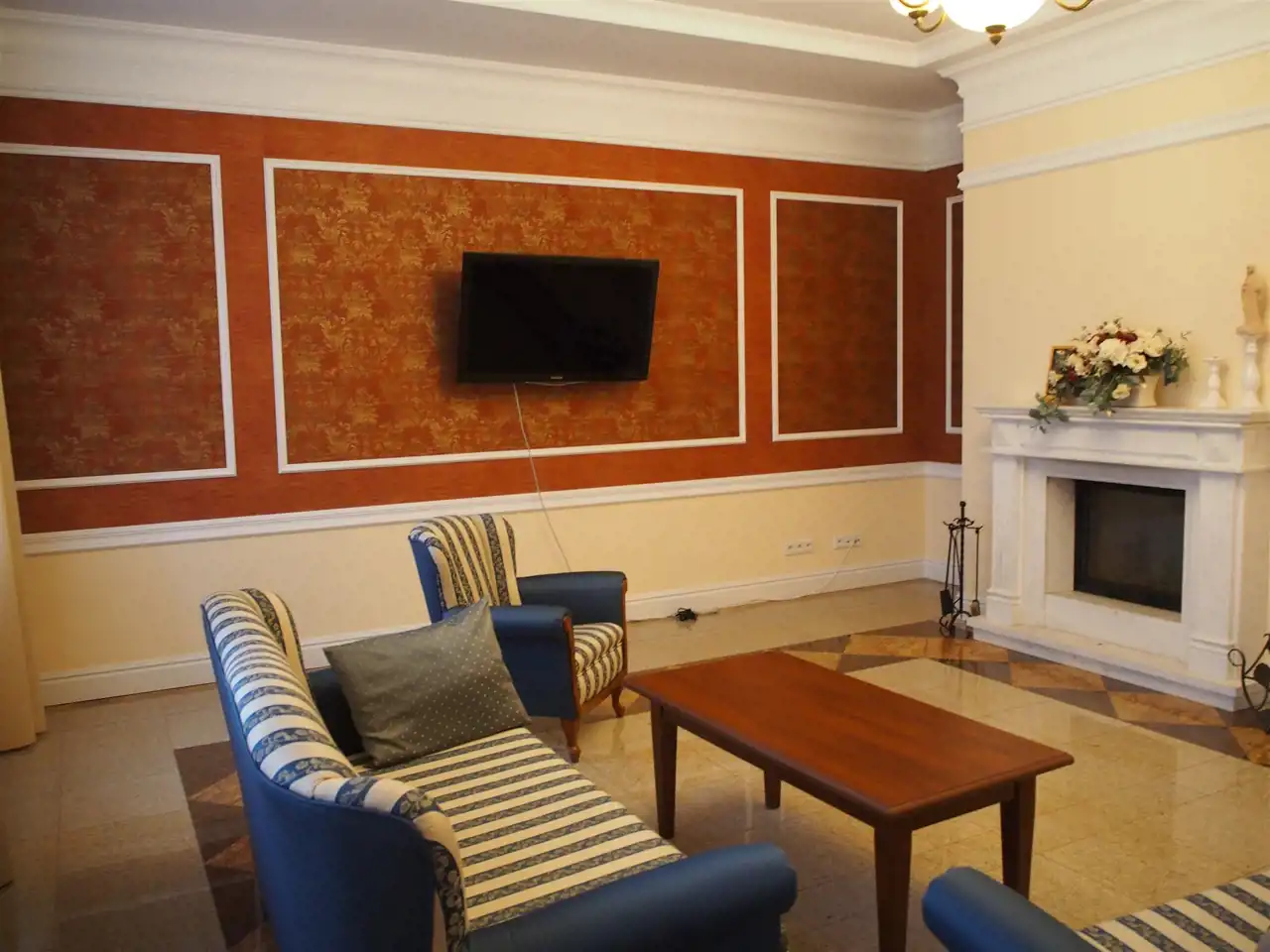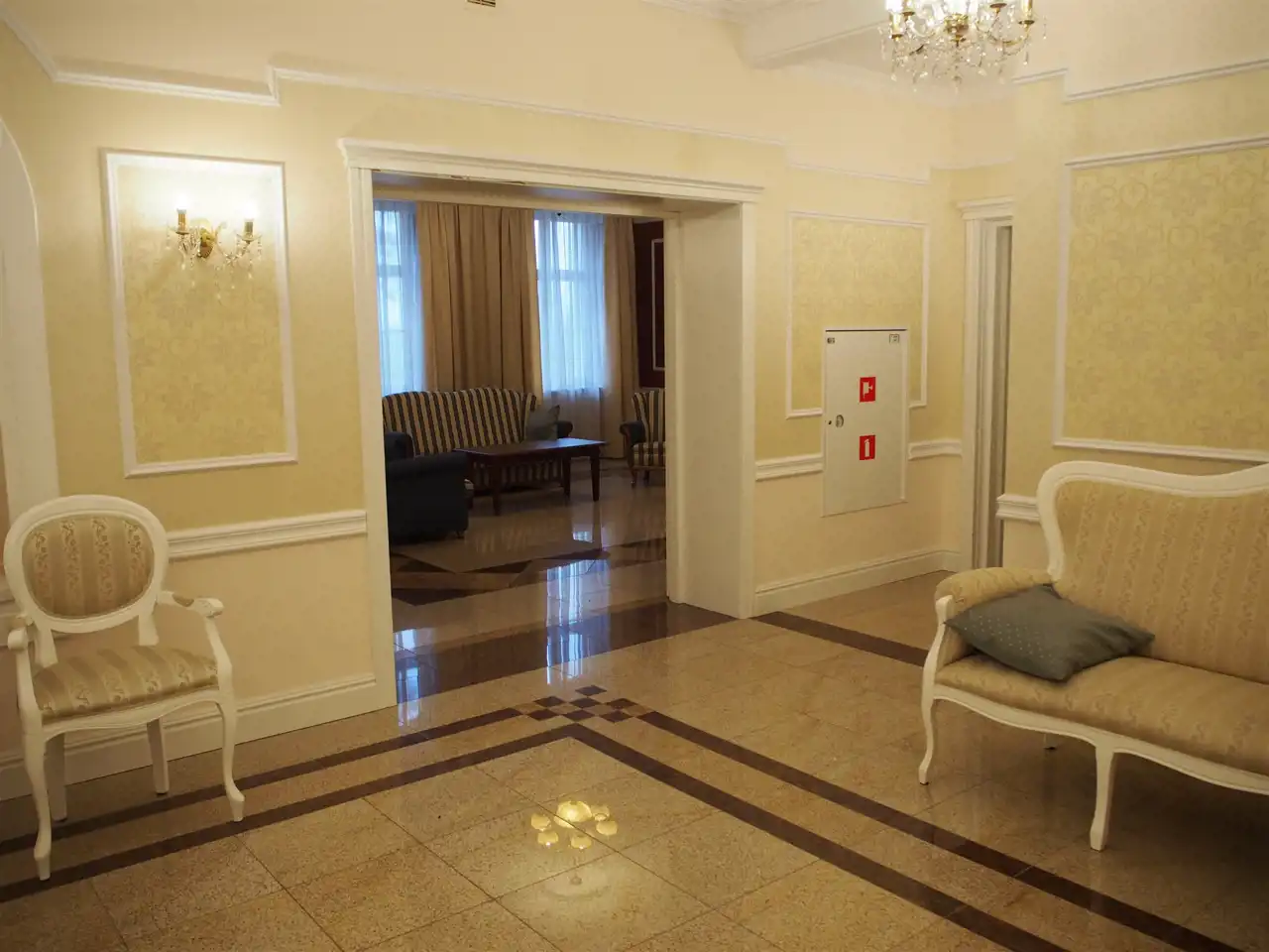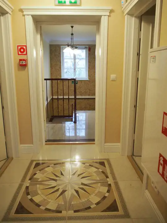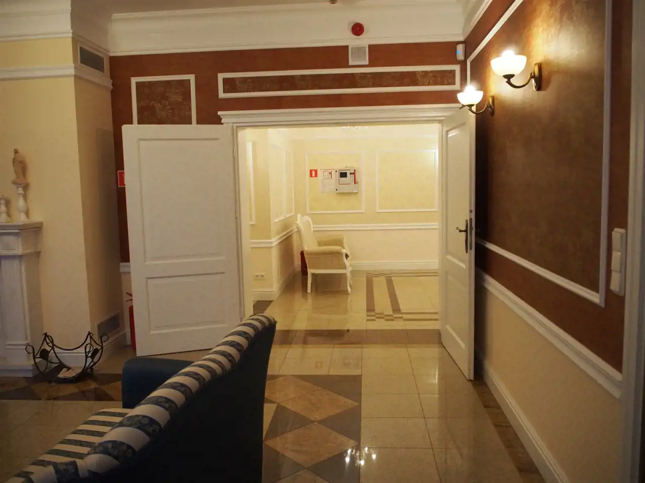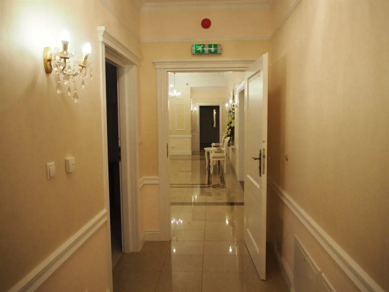 Korytarz główny od klatki schodowej, 2 salony (duże pokoje z ozdobnymi kominkami wolnostojącymi), 2 kuchnie, 4 łazienki, 2 korytarze, 6 pokoi.