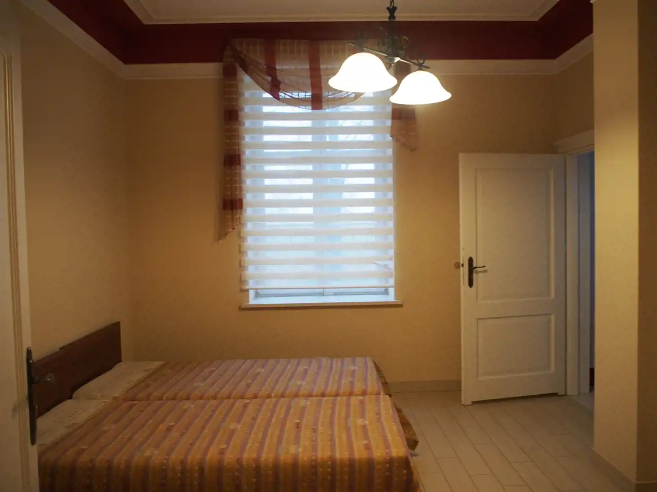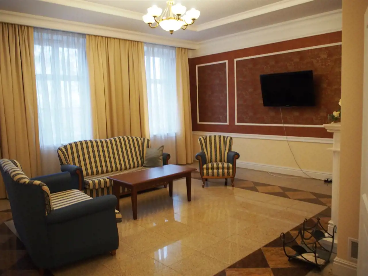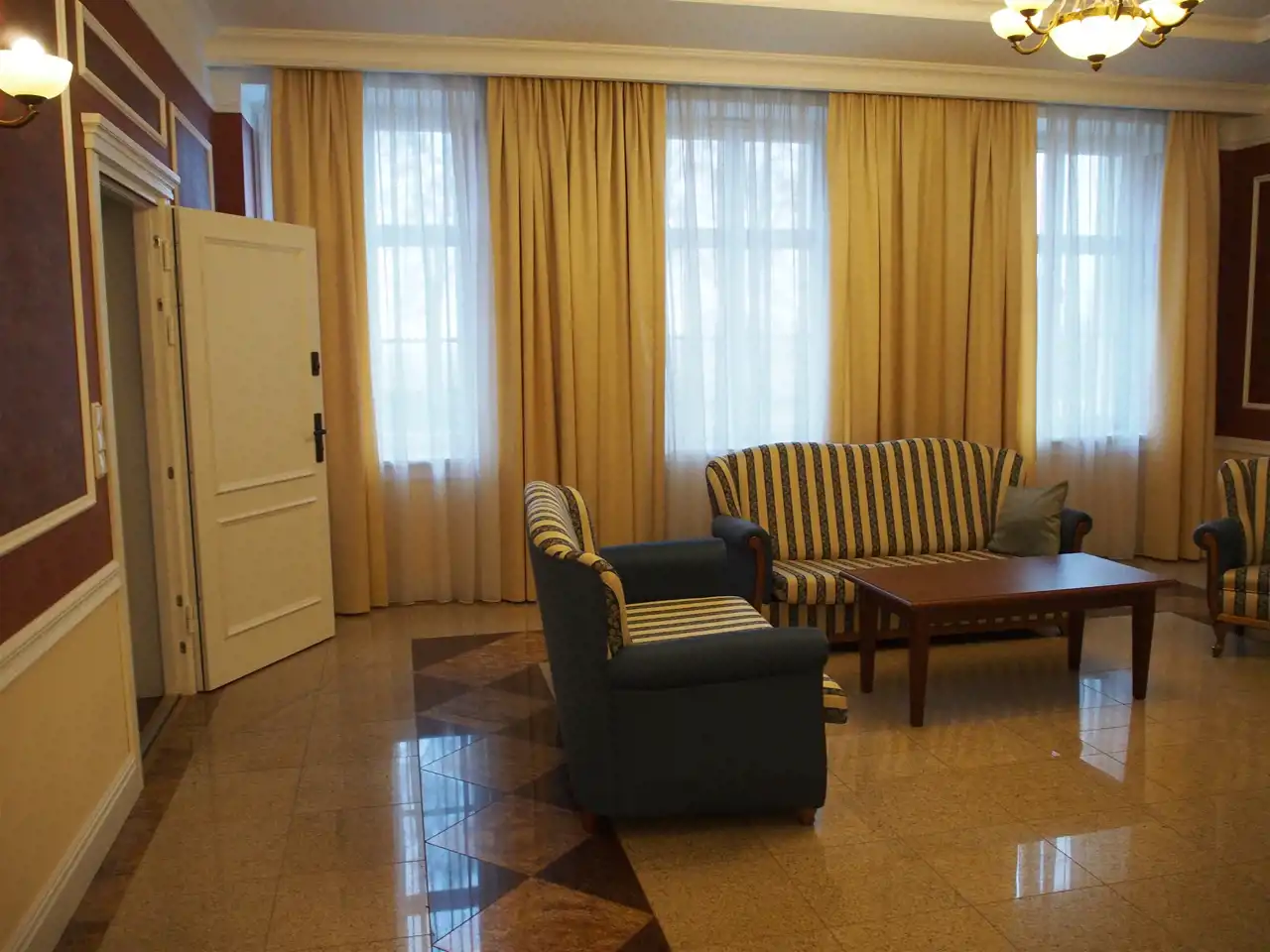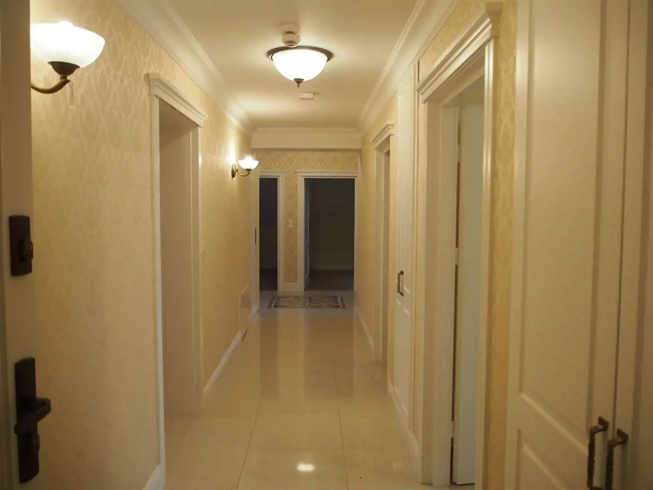 Korytarz główny od klatki schodowej, 2 salony (duże pokoje z ozdobnymi kominkami wolnostojącymi), 2 kuchnie, 4 łazienki, 2 korytarze, 6 pokoi.