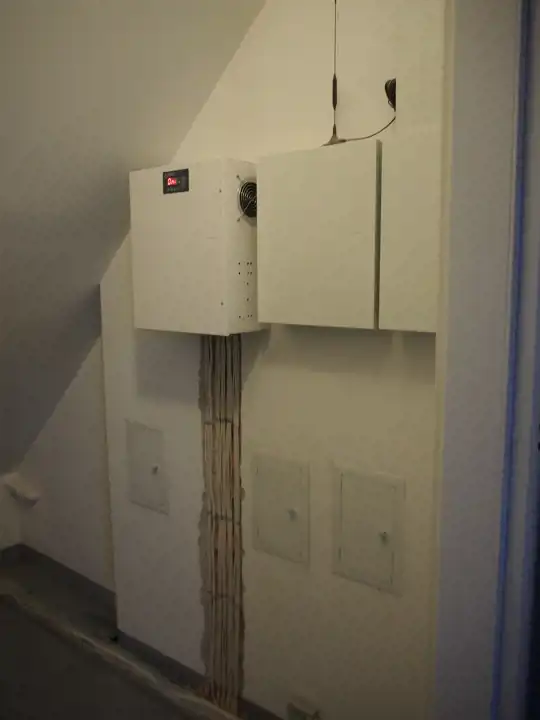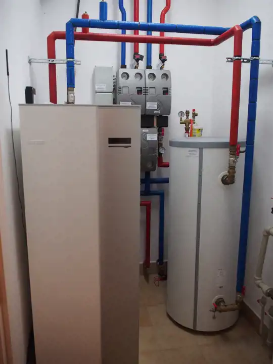 Centralnego ogrzewania – pompa ciepła (piec z trzema rozdzielnikami), w całym budynku jest ogrzewania podłogowe, źródło ciepła to sondy pionowe 8 sztuk, odwierty każdy po 100 metrów w głąb ziemi.