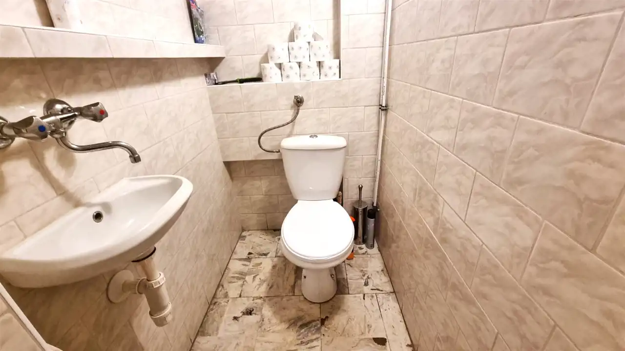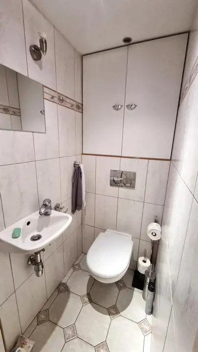 w WC : sedes, umywalka, podłoga podłoga marmur łupany, ściany glazura,