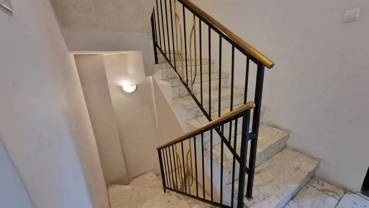 ELEGANCKA KLATKA SCHODOWA : schody betonowe, okładzina podłoga marmur, barierki metalowe