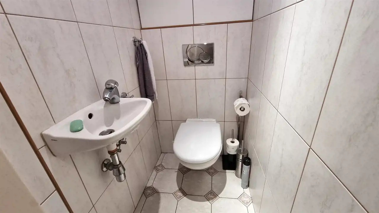 w WC : sedes, umywalka, podłoga podłoga marmur łupany, ściany glazura,