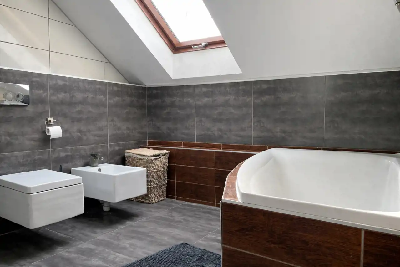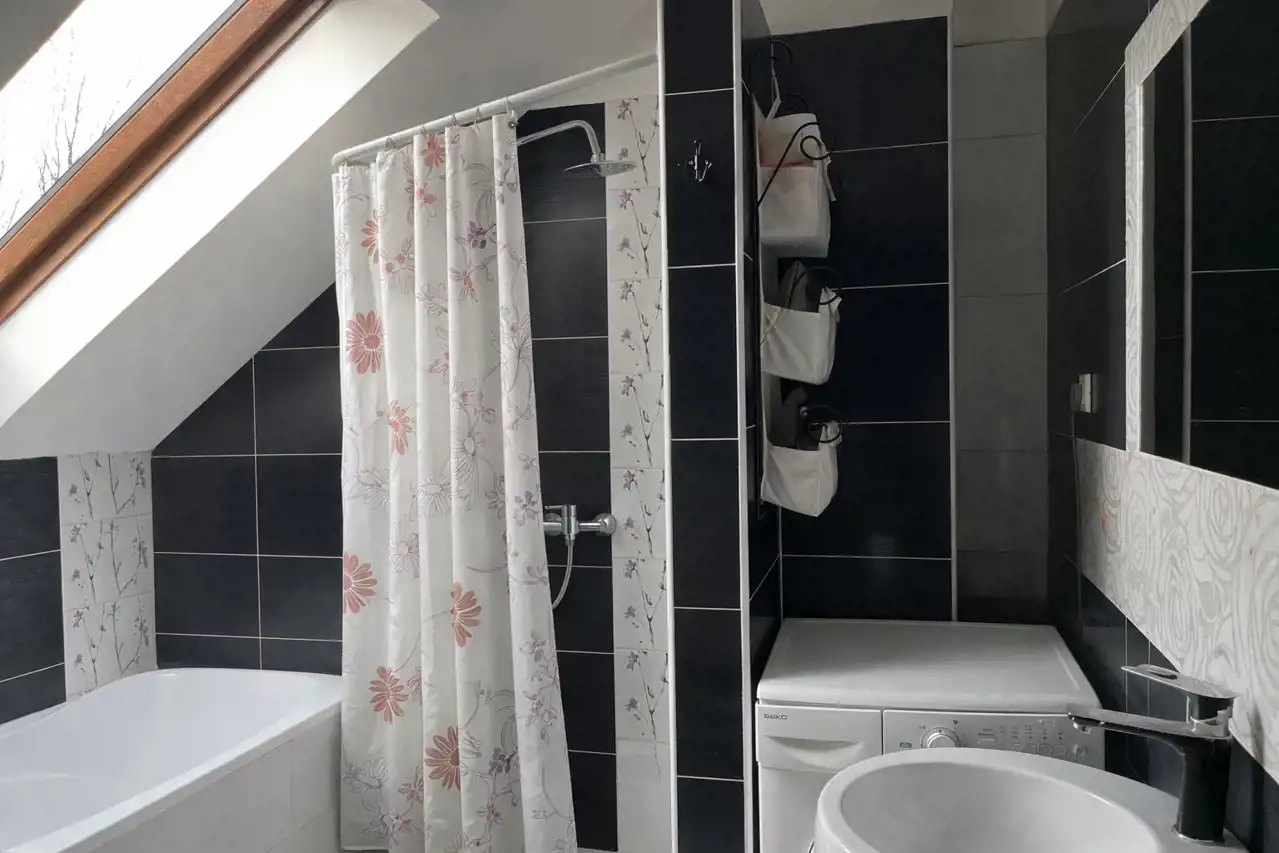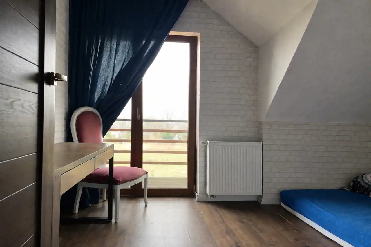 Na uwagę zasługuje komfort użytkowania. Parter wyposażony jest w ogrzewanie podłogowe, zarówno w salonie, jak i w łazience, co realnie podnosi wygodę codziennego życia. Na poddaszu ogrzewanie podłogowe znajduje się w łazienkach. System grzewczy oparty jest na piecu na ekogroszek oraz kominku, co daje niezależność i kontrolę kosztów.