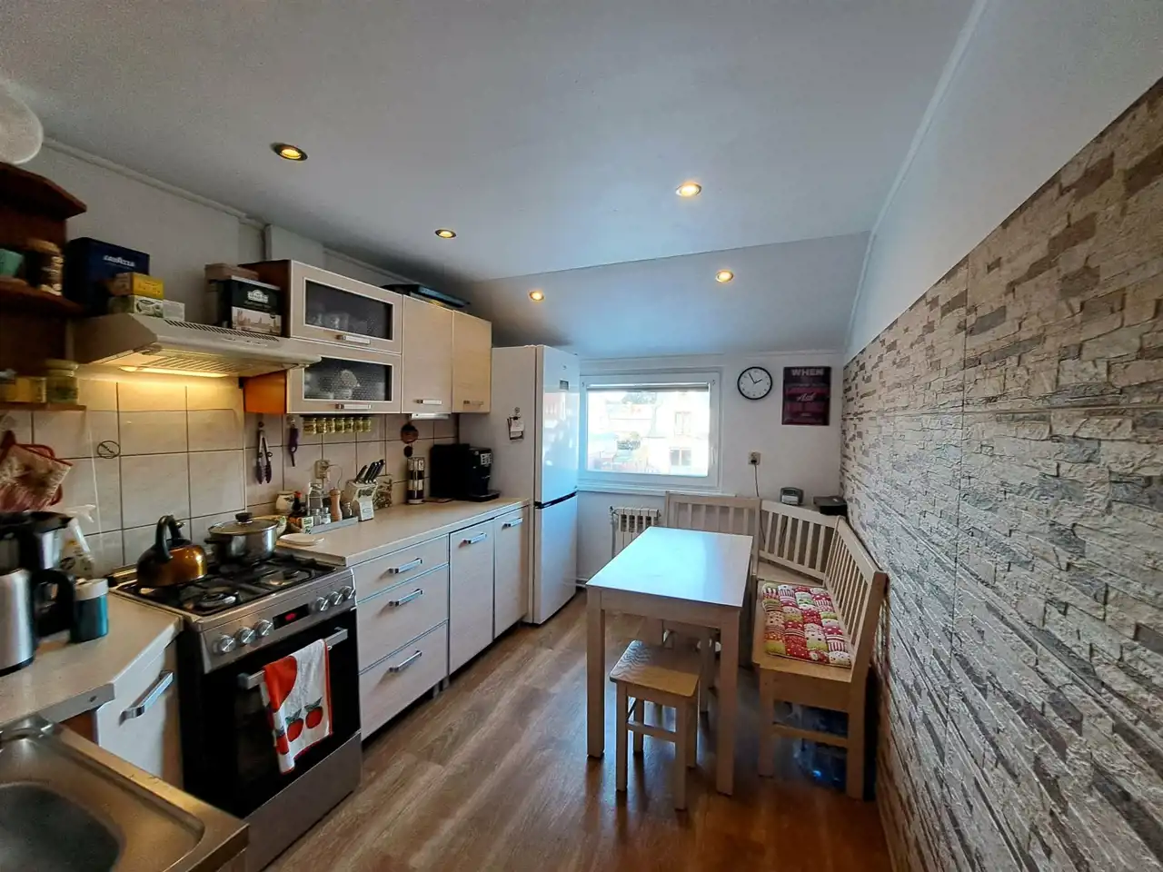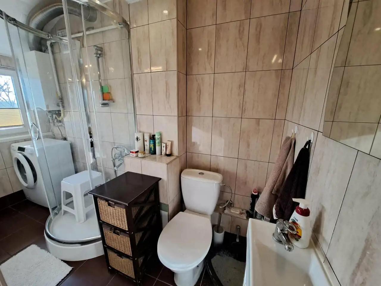 Pokoje: ok. 30 i 8m2. W pokojach na podłogch są panele a na ścianach tapety. W kuchni: meble kuchenne wraz ze sprzętem AGD (bez lodówki) w cenie mieszkania. Łazienka i WC w jednym pomieszczeniu. W łazience: nowa kabina prysznicowa, umywalka z szafką, WC-kompakt i dwufunkcyjny piec gazowy.