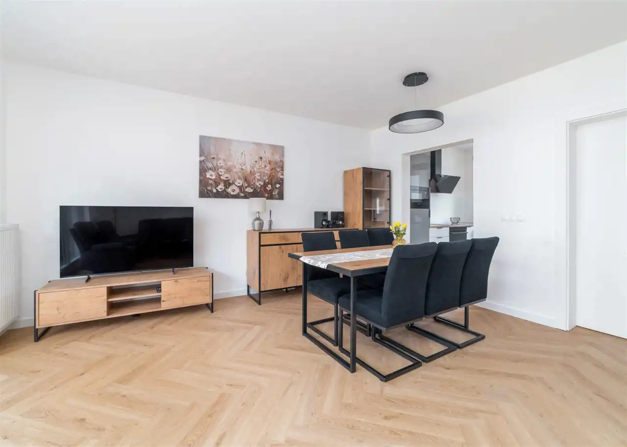 - przestronny salon z wygodnym kompletem wypoczynkowym, stolikiem kawowym, szafką RTV, telewizorem LED i częścią jadalnianą wyposażoną w stół z 6 krzesłami, komodę i witrynę;