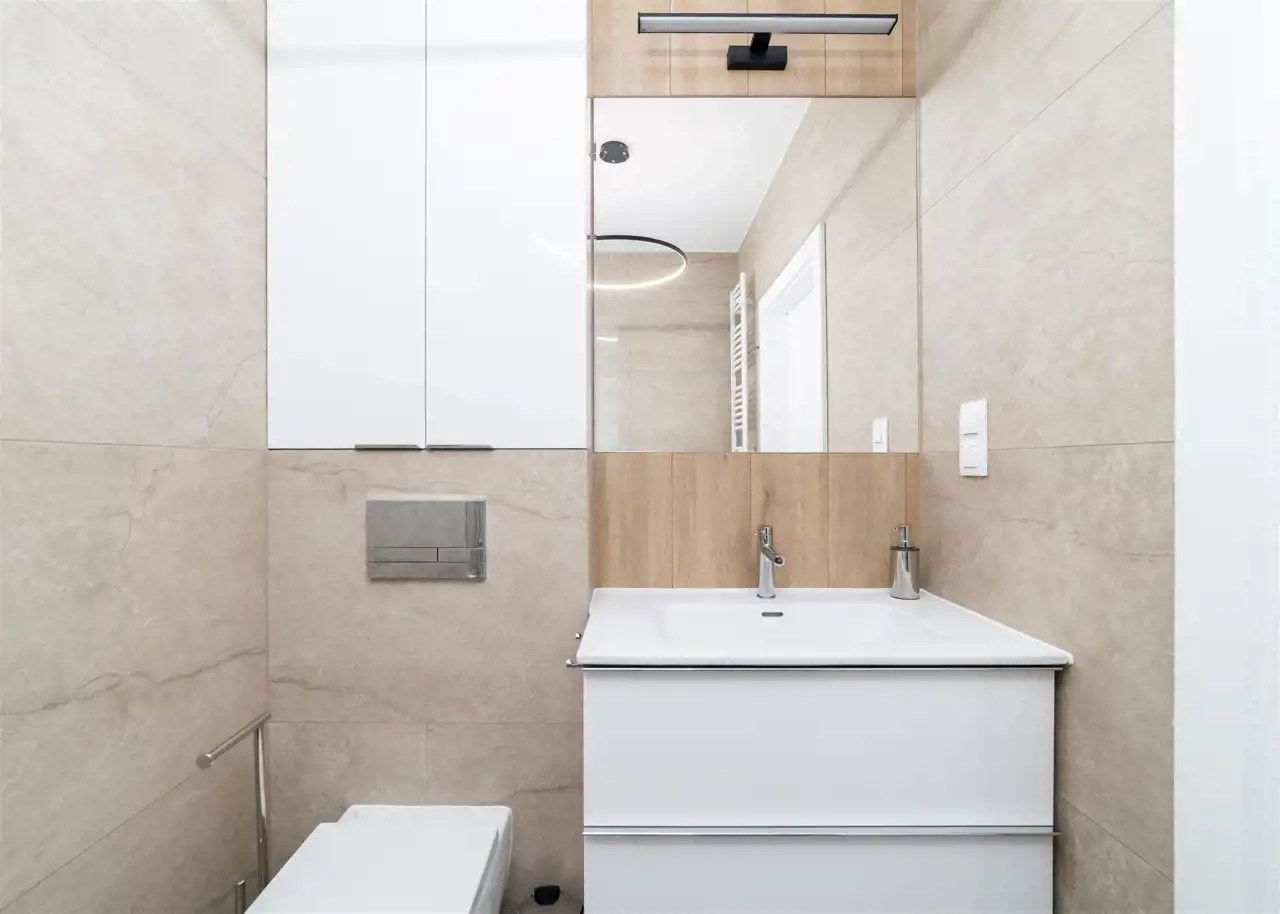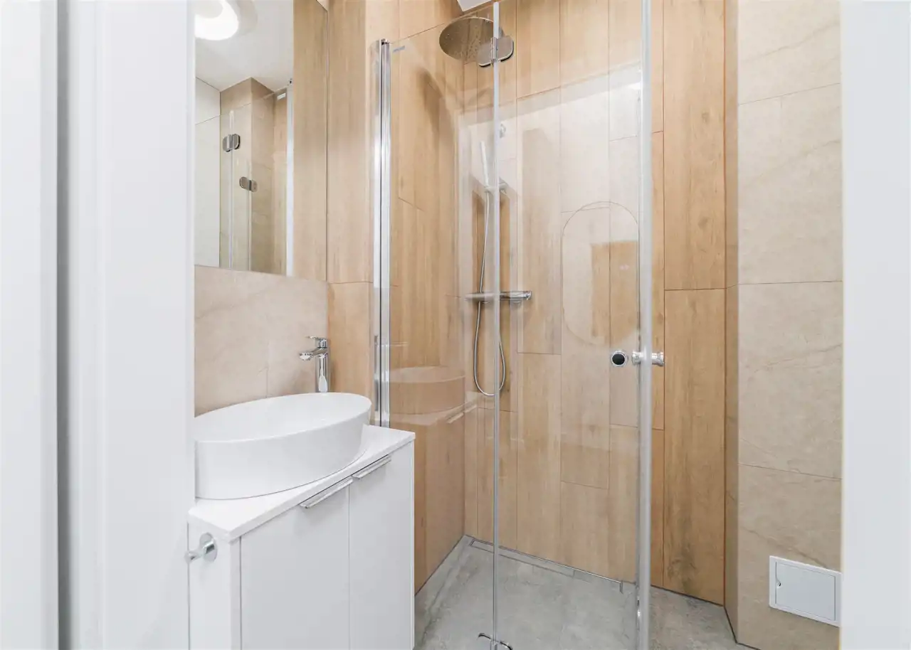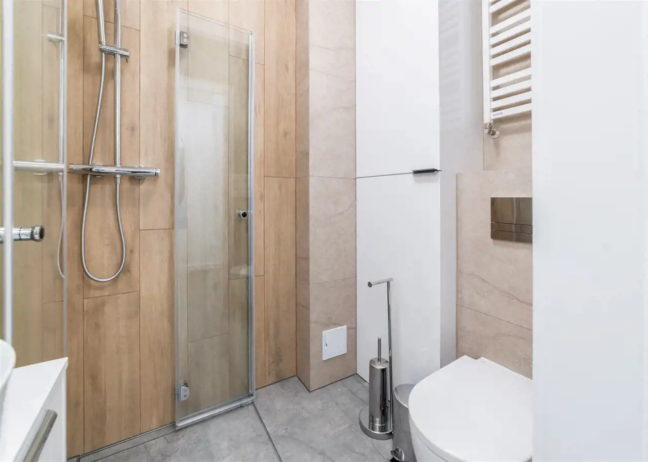 - łazienka z WC wyposażona w kabinę prysznicową i umywalkę;