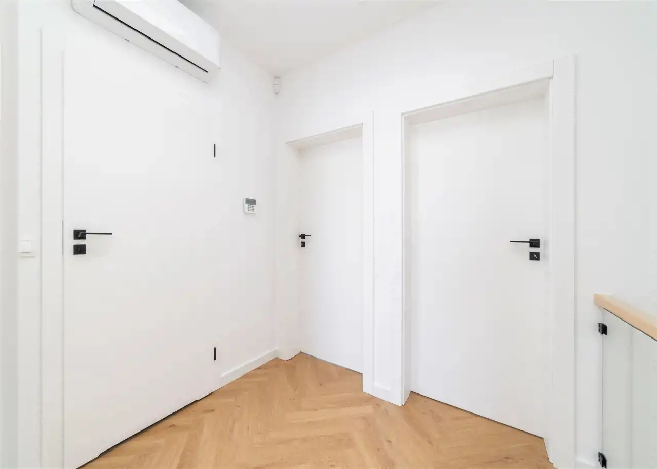 Dom posiada system klimatyzacji oraz alarm podłączony do grupy interwencyjnej i oferuje 2 poziomy: