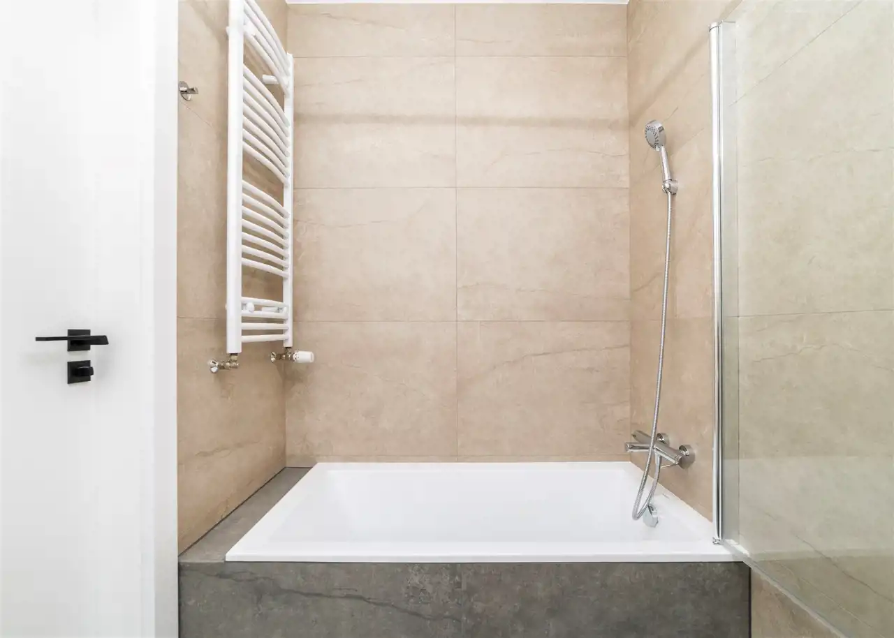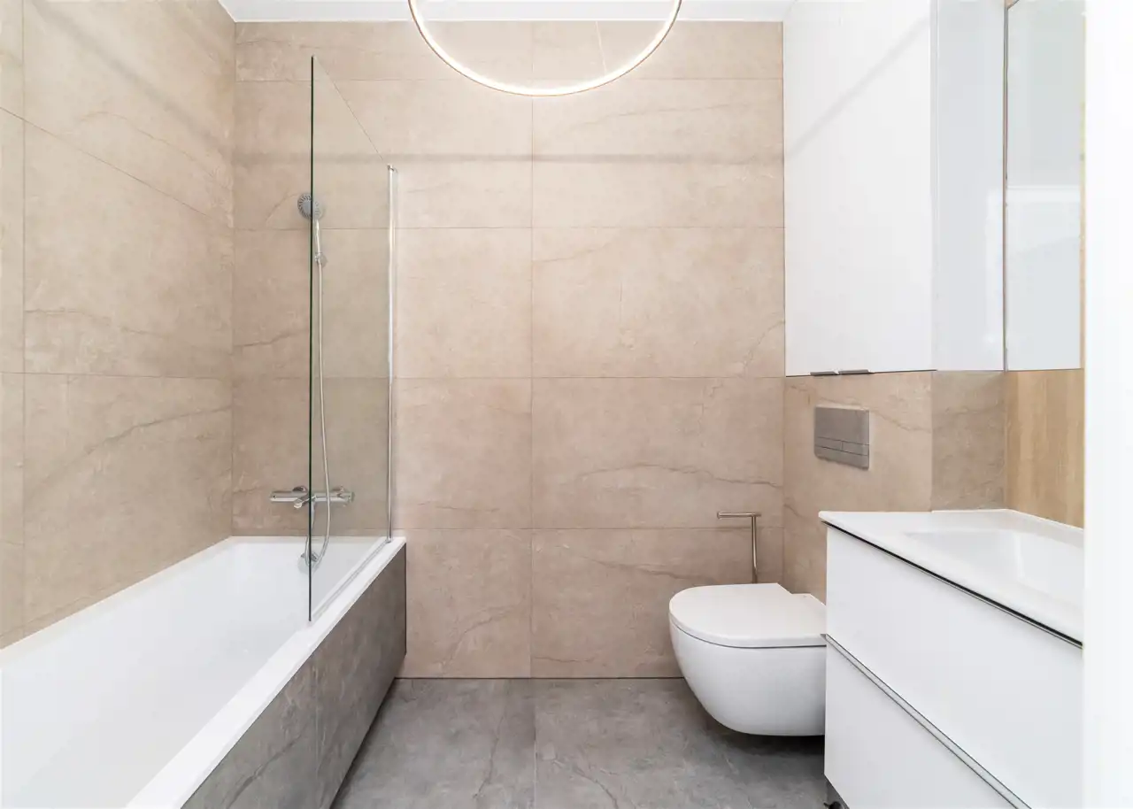 - łazienka z WC wyposażona w wannę z funkcją prysznica i umywalkę.