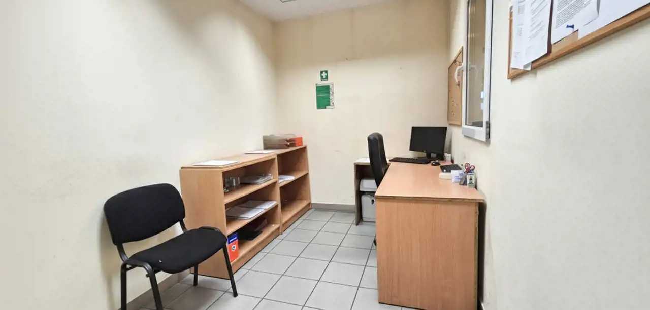 Powierzchnia: 132 m² + 52 m² (magazyn, dwa pomieszczenia biurowe, łazienka z prysznicem i wc, kuchnia, szatnia)
