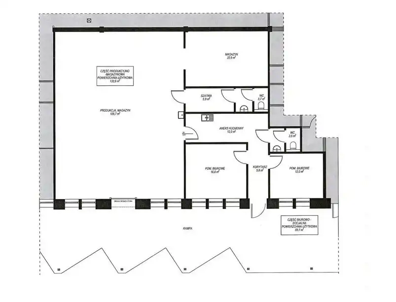 - powierzchnia biurowo-socjalna - 69 m2 w tym 2 pomieszczenia biurowe, szatnia, kuchnia, 2xWC