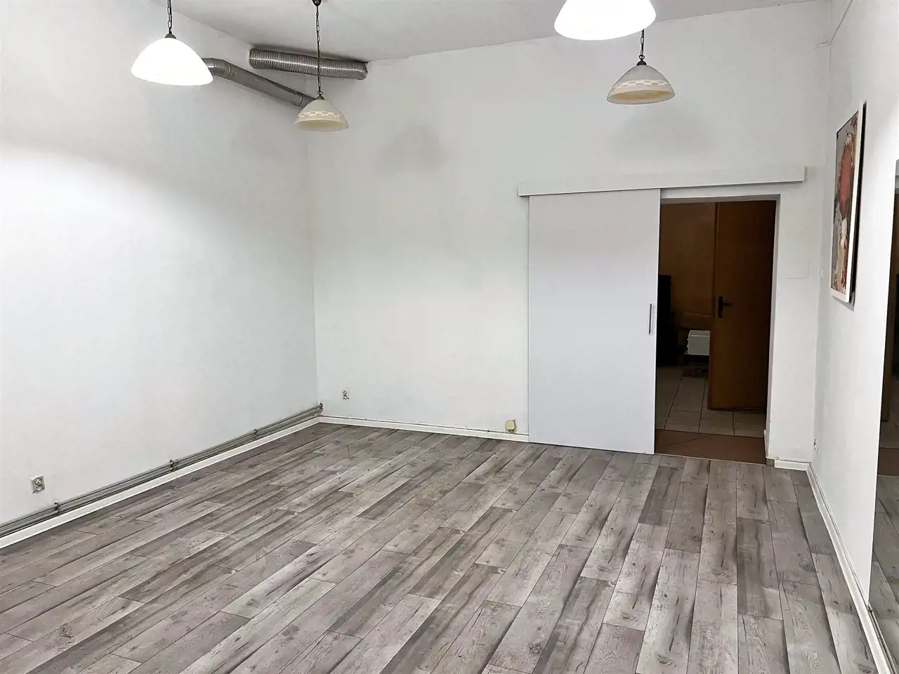 - POMIESZCZENIE I - SALA GŁÓWNA (SALA SPRZEDAŻY) - ok. 28 m, podłoga panele, ściany gładzie, oświetlenie: lampy wiszące, okno wystawowe z roletami antywłamaniowymi - wejście do tego pomieszczenia bezpośrednio z ulicy, do pozostałej części lokalu wejście przez drzwi przesuwne,
