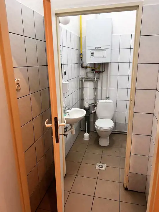 - SANITARIAT: ok. 3 m, na wprost wejścia z bramy, sedes, umywalka, piec gazowy Vaillant,