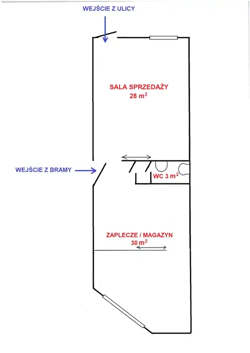 Lokal składa się z dwóch pomieszczeń: sala sprzedaży - główne pomieszczenie od frontu oraz mniejsze od podwórka, dodatkowo sanitariat. Lokal jest wykończony, podłogi terakota, sufity podwieszane z oświetleniem, ściany gładzie gipsowe malowane. Lokal posiada witrynę okienną, okna i drzwi drewniane z roletami antywłamaniowymi. Są 2 wejścia do lokalu - jedno bezpośrednio z ulicy oraz drugie z bramy wjazdowej.