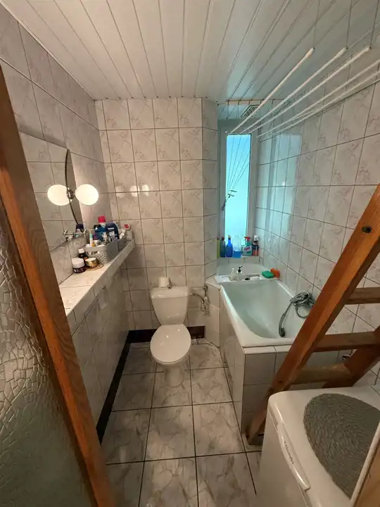 - łazienka z oknem 3m2 z oknem na północ ( nad całą łazienka antresola), ogrzewanie grzejnik elektryczny konwektor 500W, na podłodze terakota, ściany glazura