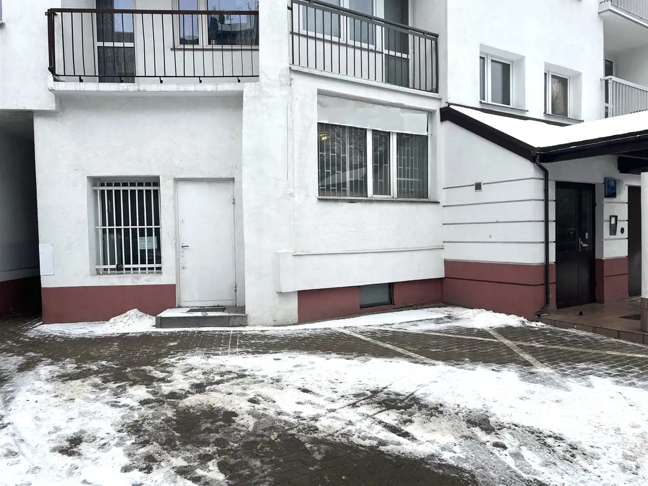 - WEJŚCIE: do sali głównej na parterze z poziomu gruntu, do biur wejście z klatki schodowej wieżowca,