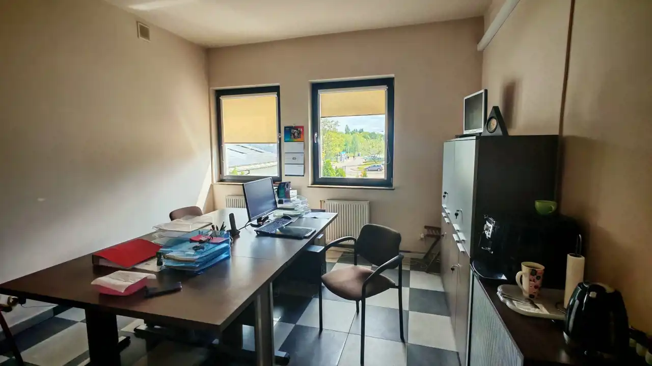 Do wynajęcia lokal biurowy w budynku biurowym na 1. piętrze. Lokal składa się z 4 pokoi, kuchni oraz toalety. Przed budynkiem znajdują się miejsca parkingowe. Teren nieruchomości jest ogrodzony, zamykany i chroniony.