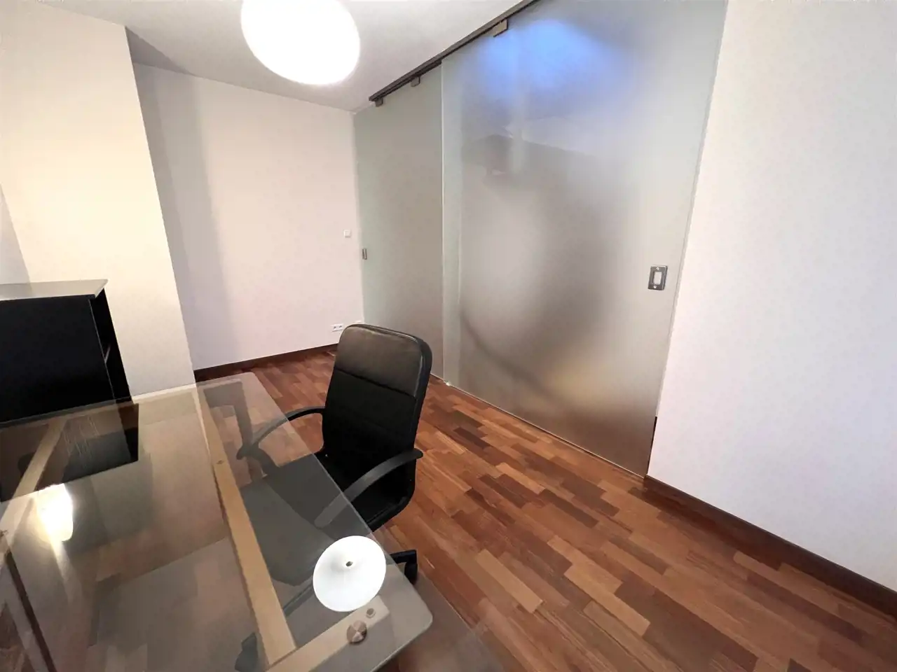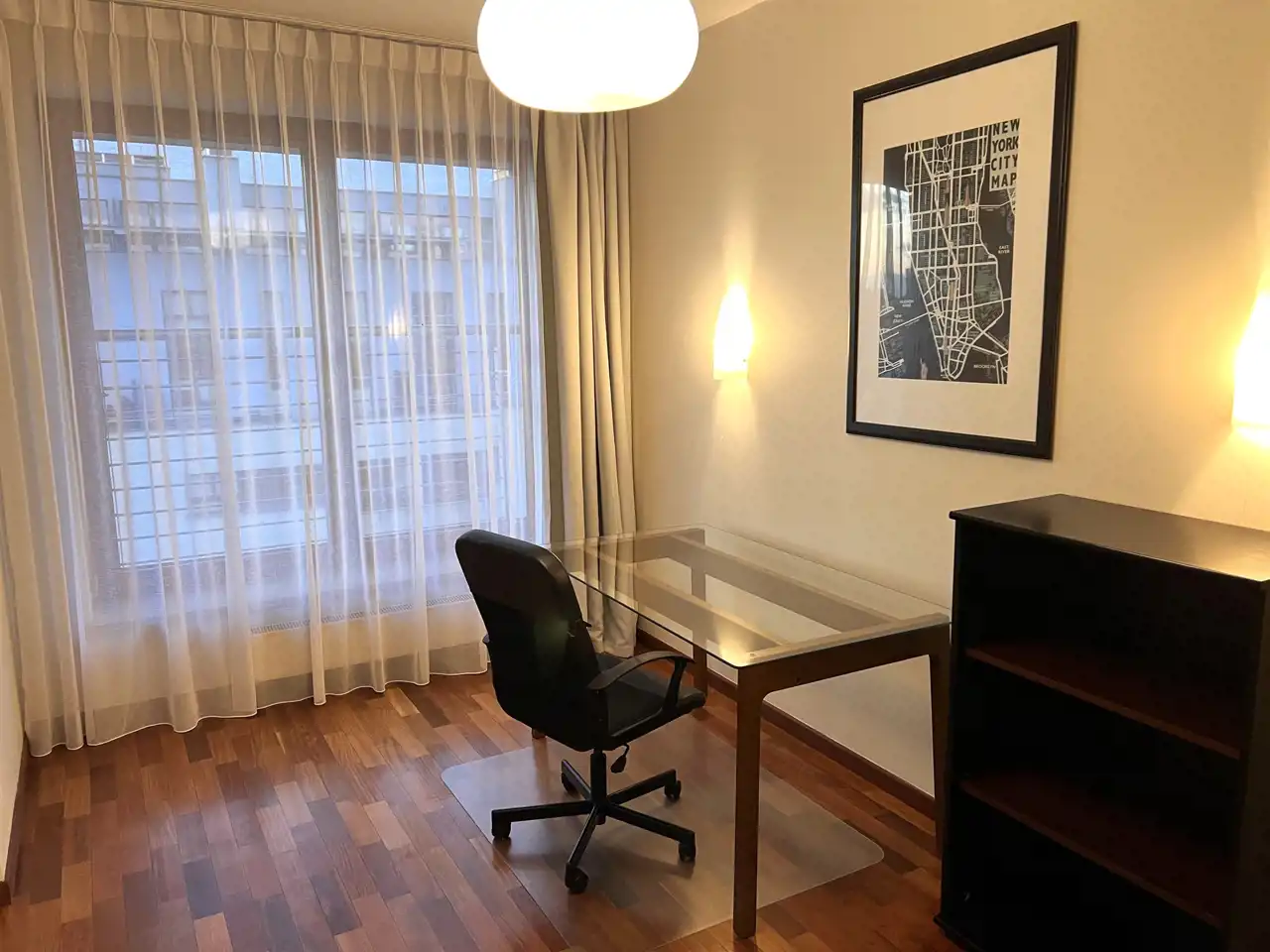- GABINET/DRUGA SYPIALNIA: 12 m², oddzielona od reszty mieszkania szybą lakomatową, w połowie przesuwaną, obecnie pusty, tylko biurko z blatem szklanym, krzesło na kółkach, komoda z szufladami,
