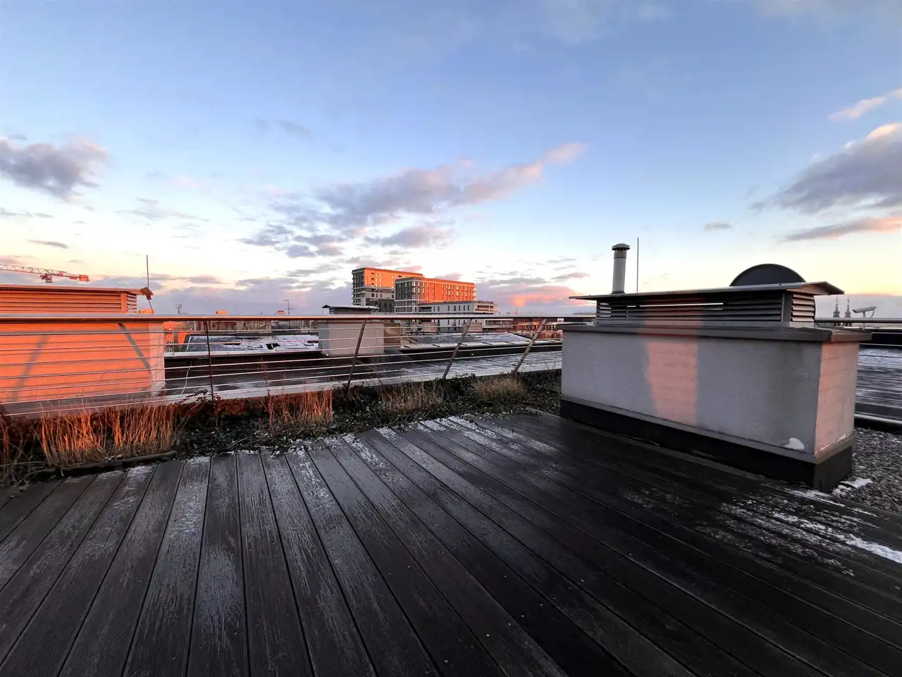 TARAS na dachu budynku, wyłożony deskami kompozytowymi, z widokiem na panoramę miasta