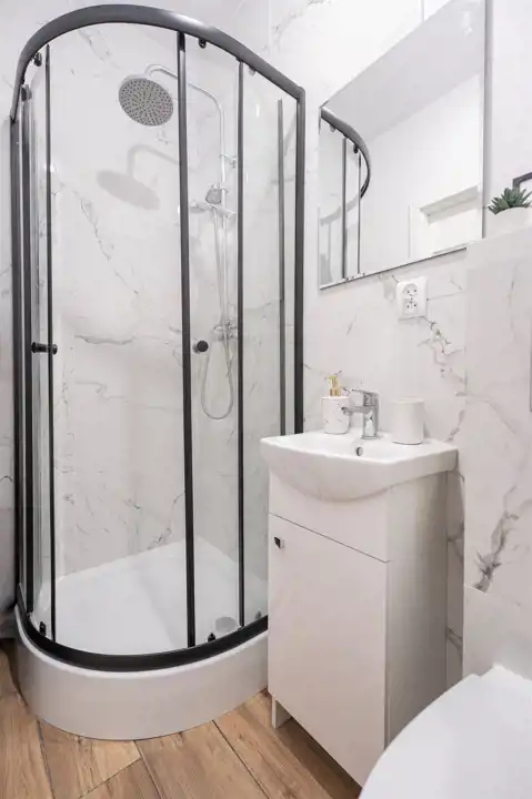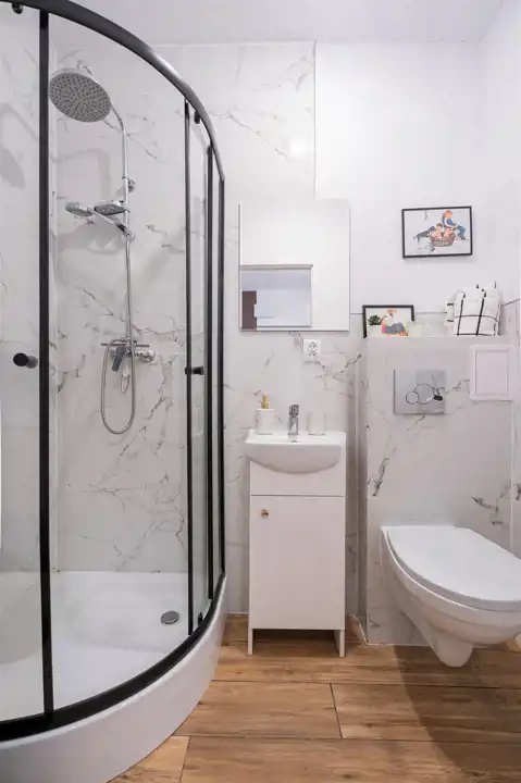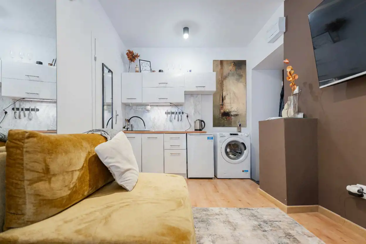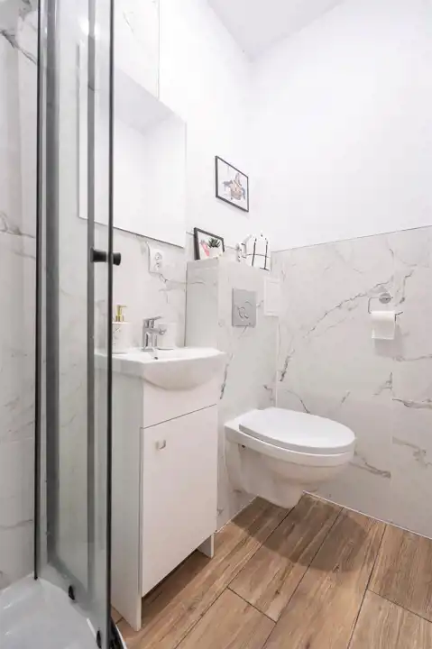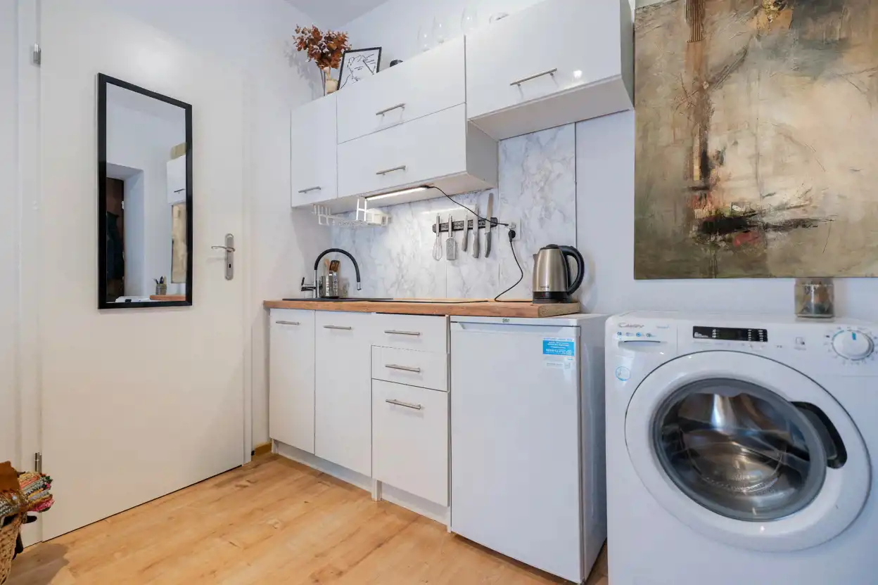 Kuchnia została w pełni wyposażona – znajdziemy tu 2-palnikową płytę indukcyjną, zmywarkę, zlewozmywak z baterią oraz pralkę, co czyni lokal gotowym do zamieszkania od zaraz. Łazienka wykończona jest w jasnej glazurze, a stonowana kolorystyka ścian (biel i ciepłe odcienie brązu) tworzy przyjemną i nowoczesną atmosferę. Na podłodze znajdują się panele.