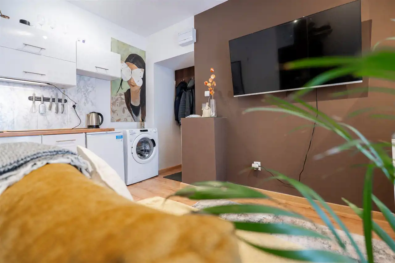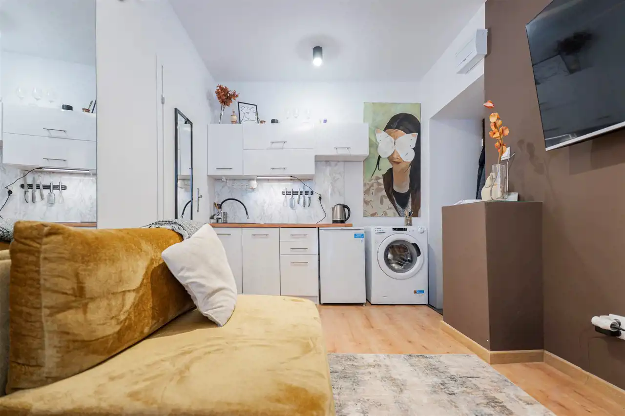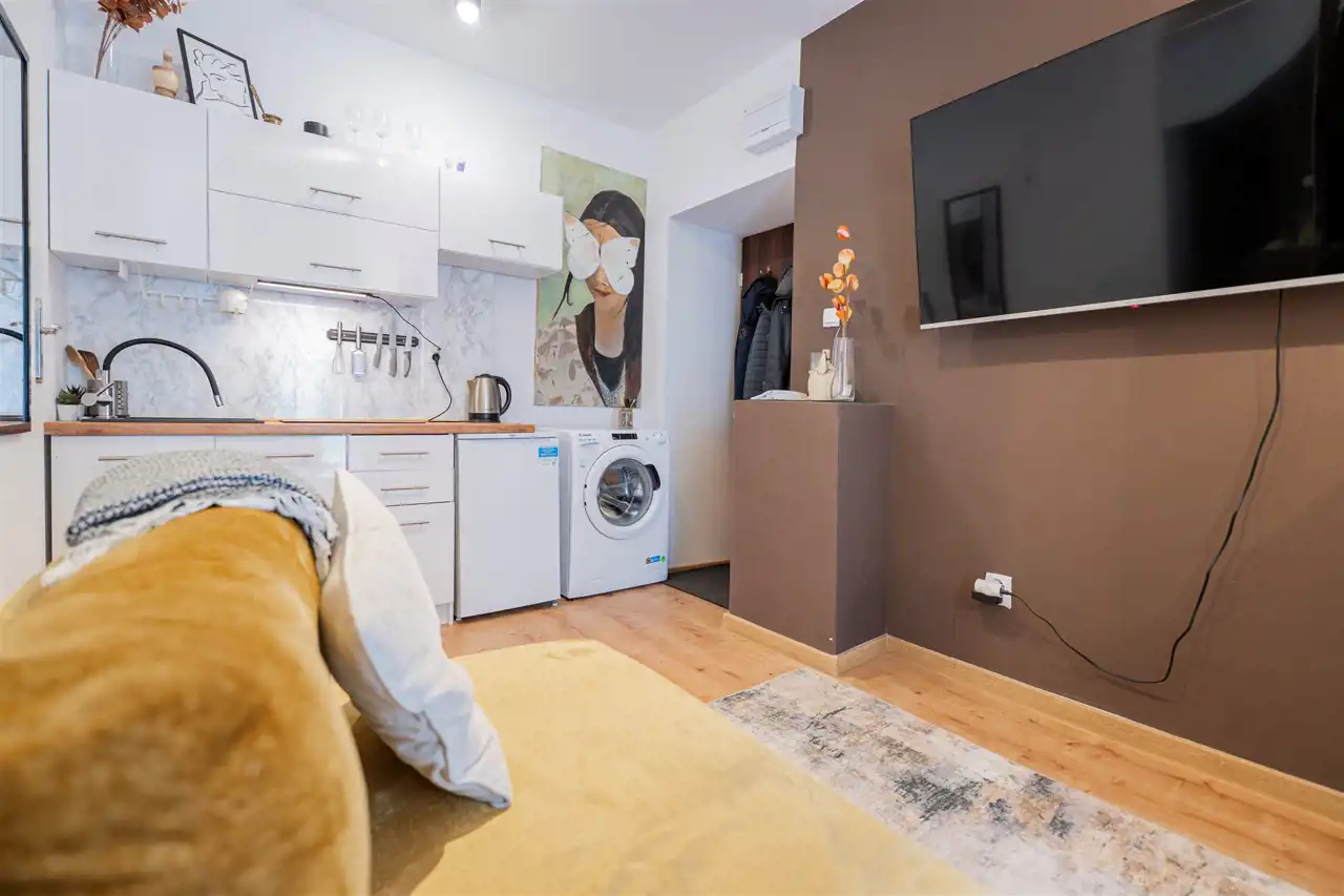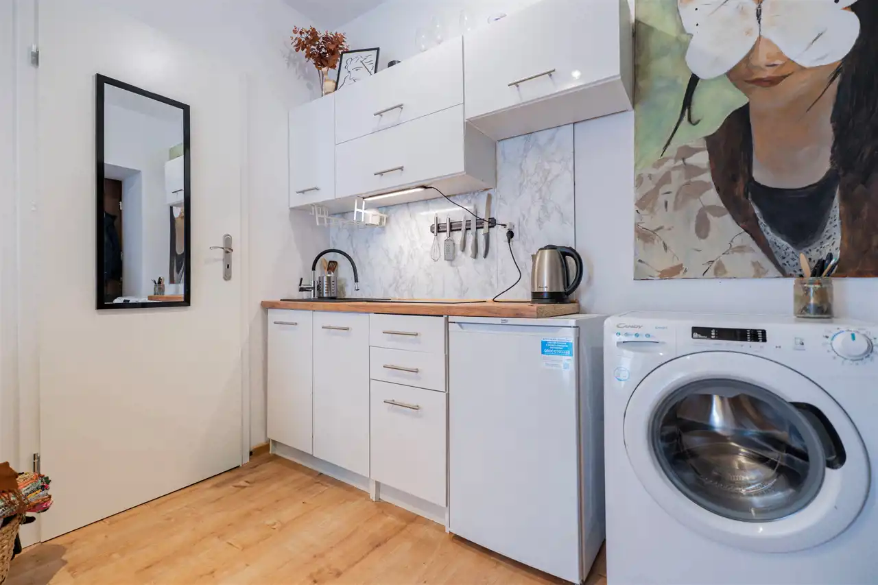 Kuchnia została w pełni wyposażona – znajdziemy tu 2-palnikową płytę indukcyjną, zmywarkę, zlewozmywak z baterią oraz pralkę, co czyni lokal gotowym do zamieszkania od zaraz. Łazienka wykończona jest w jasnej glazurze, a stonowana kolorystyka ścian (biel i szarość) tworzy przyjemną i nowoczesną atmosferę. Na podłodze znajdują się panele.