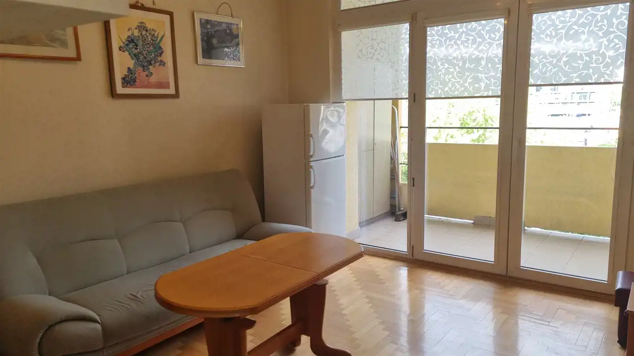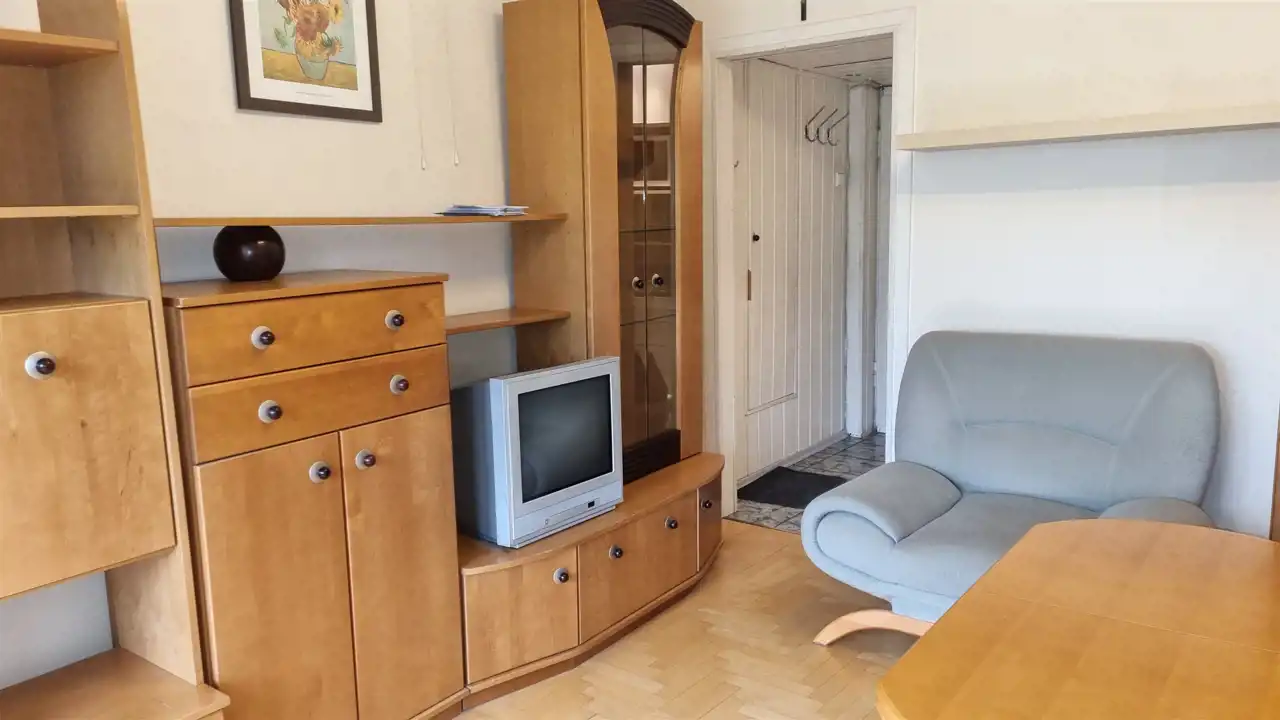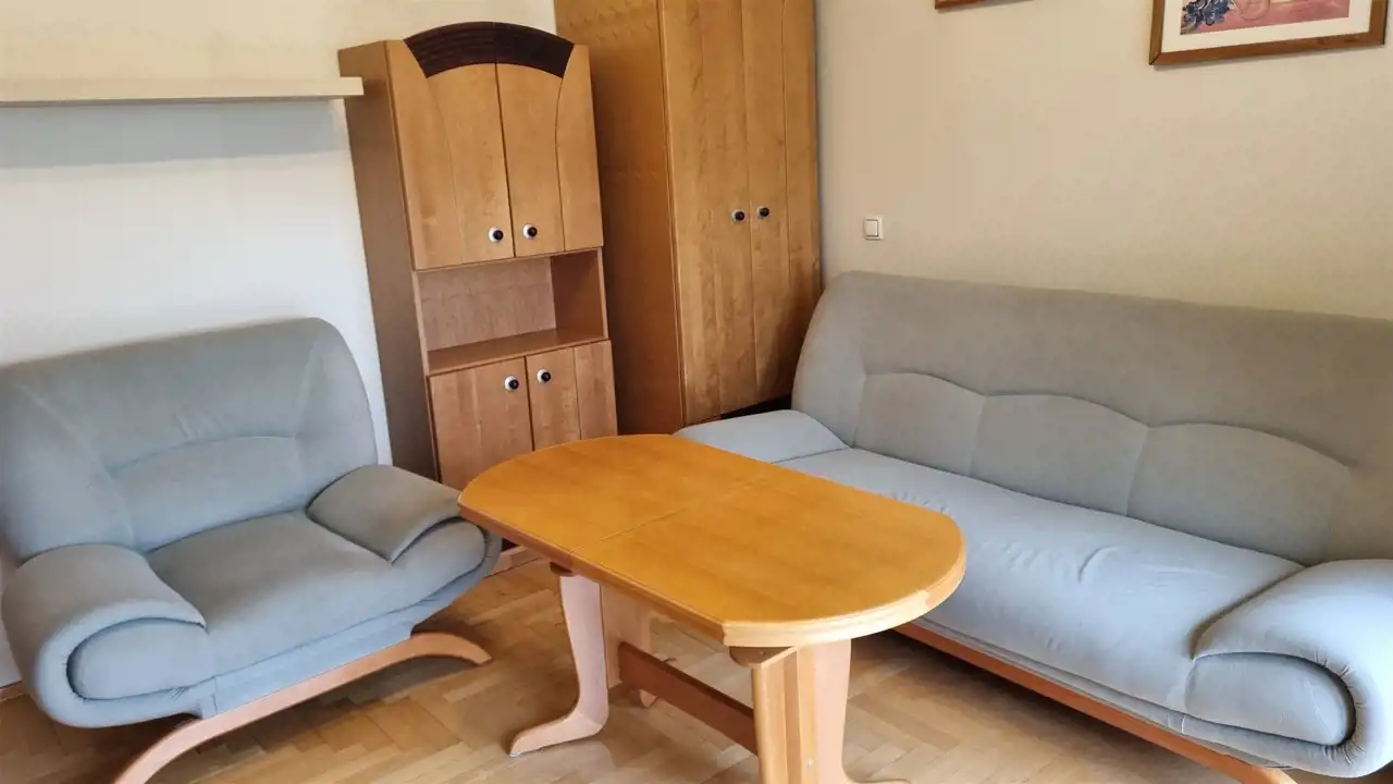 - POKÓJ: ściany: gładzie gipsowe malowane; podłoga: parkiet, kanapa rozkładana, fotel, ława, biurko, segment, lodówka