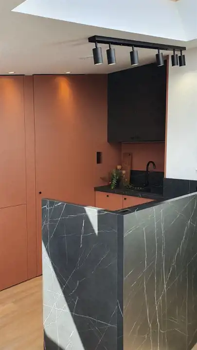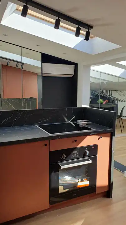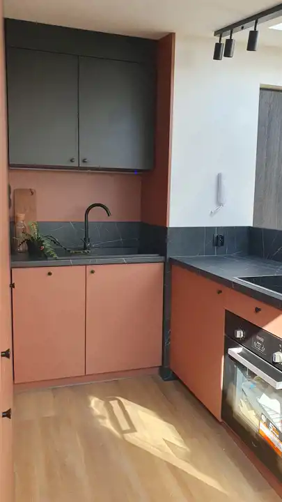 Kuchnia w zabudowie pod wymiar w pełni wyposażona w sprzęt AGD: zmywarka, płyta indukcyjna, lodówka, zamrażarka, piekarnik. Meble kuchenne wyposażone w system Blum, który odpowiada za ciche i delikatne zamykanie frontów, niezależnie od obciążenia.