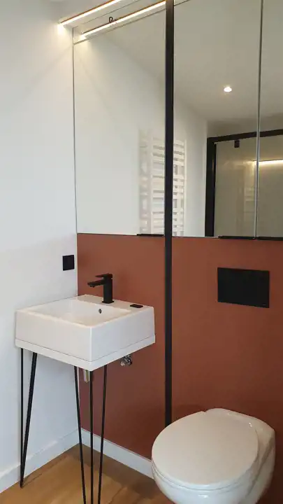 Łazienka razem z WC wyposażona w kabinę prysznicową, umywalkę z dużym lustrem oraz szafki na ręczniki i inne akcesoria łazienkowe.