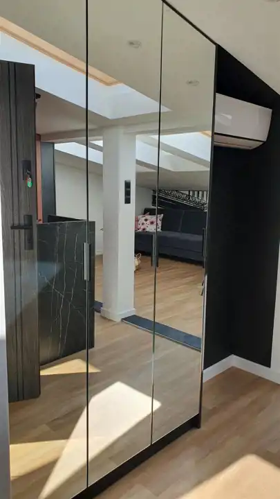 Salon wyposażony w wygodną sofę z funkcją spania, kącik telewizyjny oraz stół i krzesła. Przestrzeń pod skosami została zagospodarowana na pojemne szafki pod wymiar z lustrzanymi frontami, co dodatkowo optycznie znacznie powiększa przestrzeń. W przedpokoju również zamontowane zostały pojemne szafy pod wymiar.