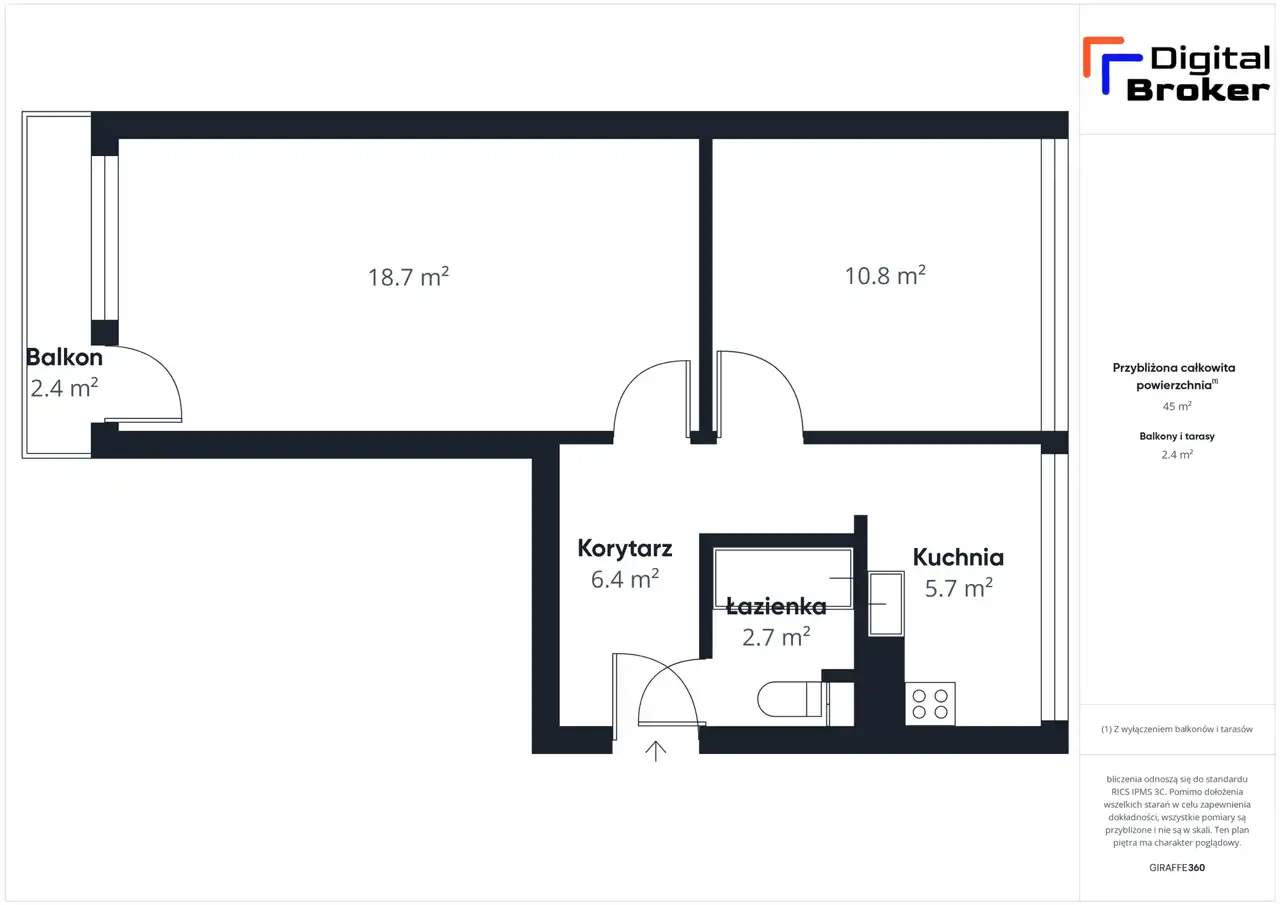 - Charakterystyka mieszkania 45.13 m2, 2 pokoje