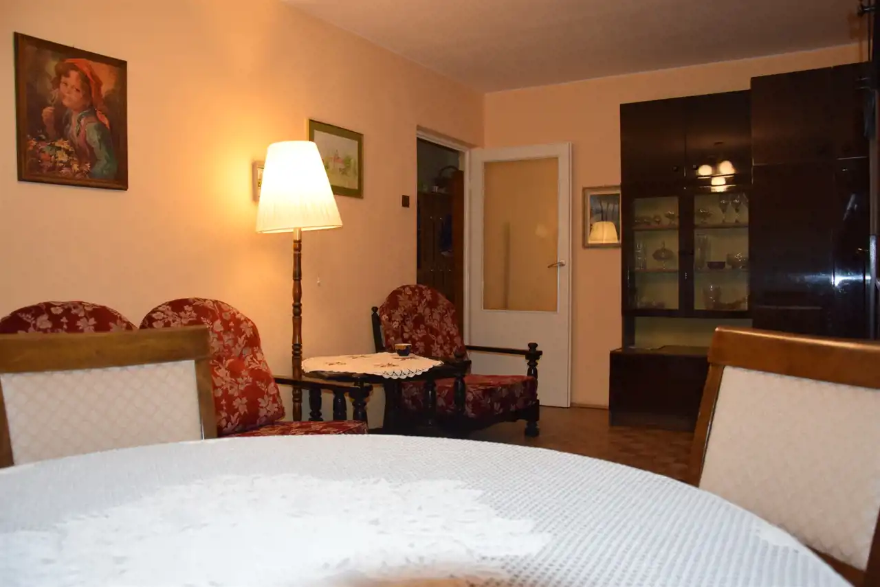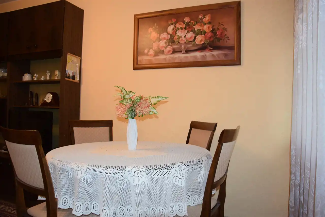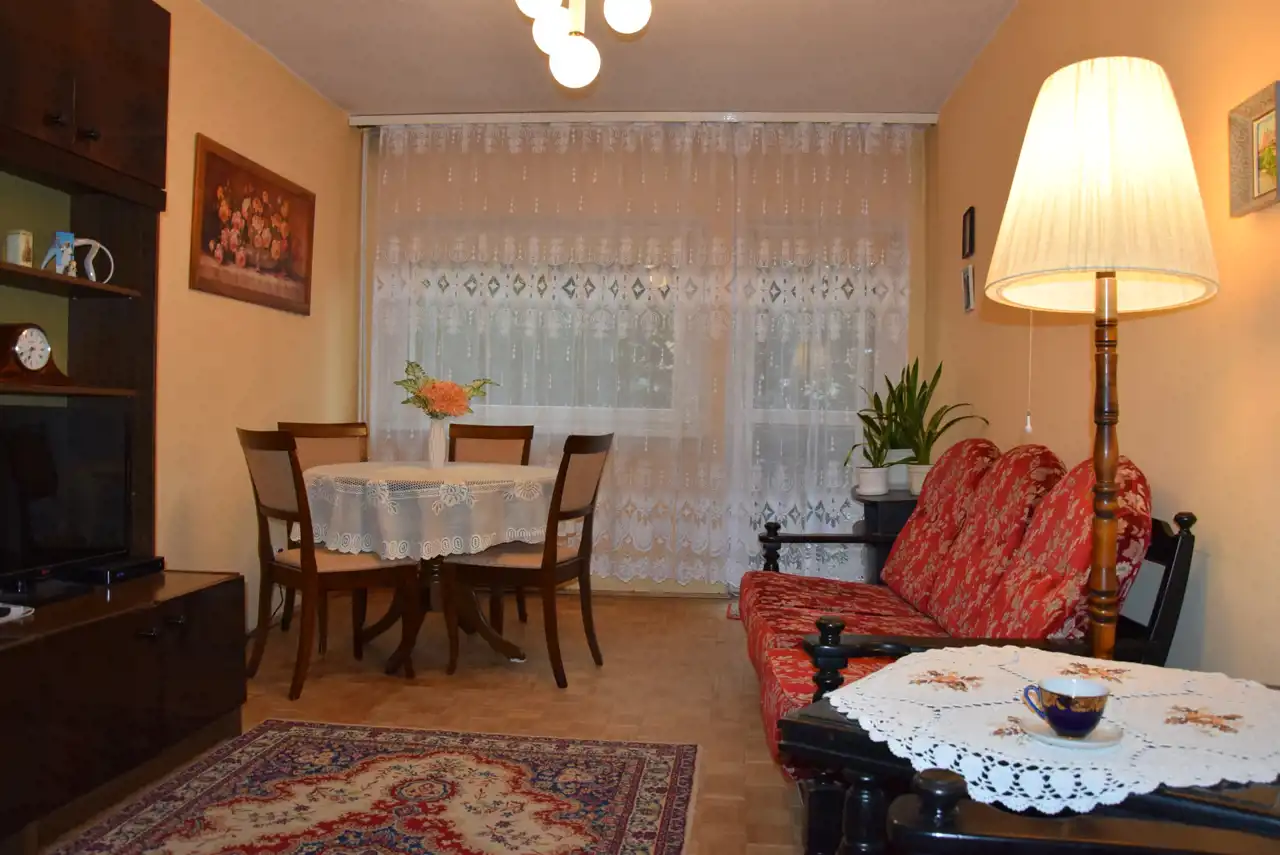Pokój dzienny jest jasny i ustawny. Podłogi w pokojach wyłożone są parkietem dębowym.