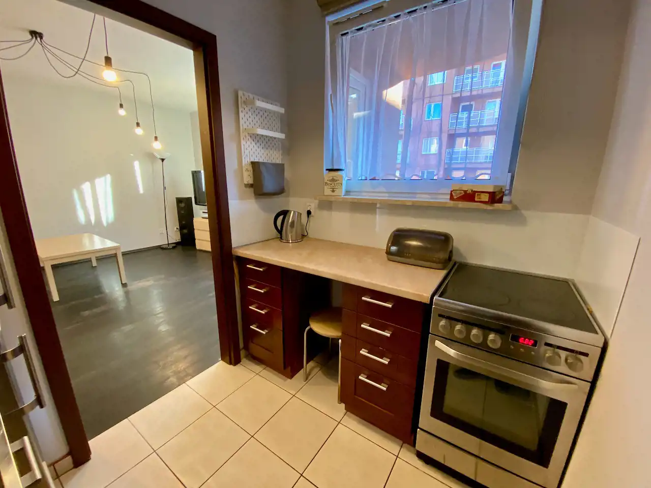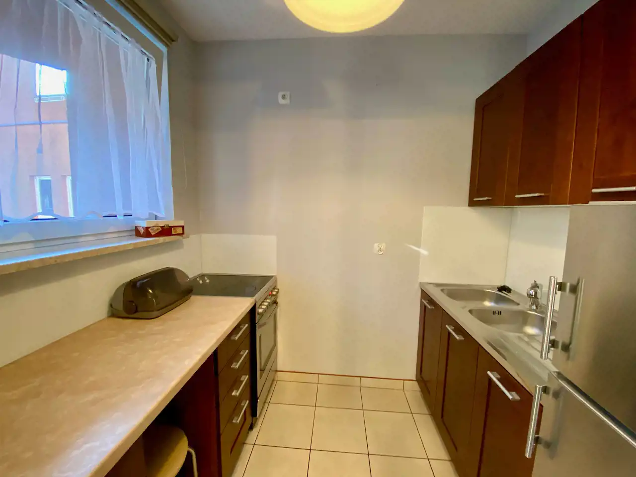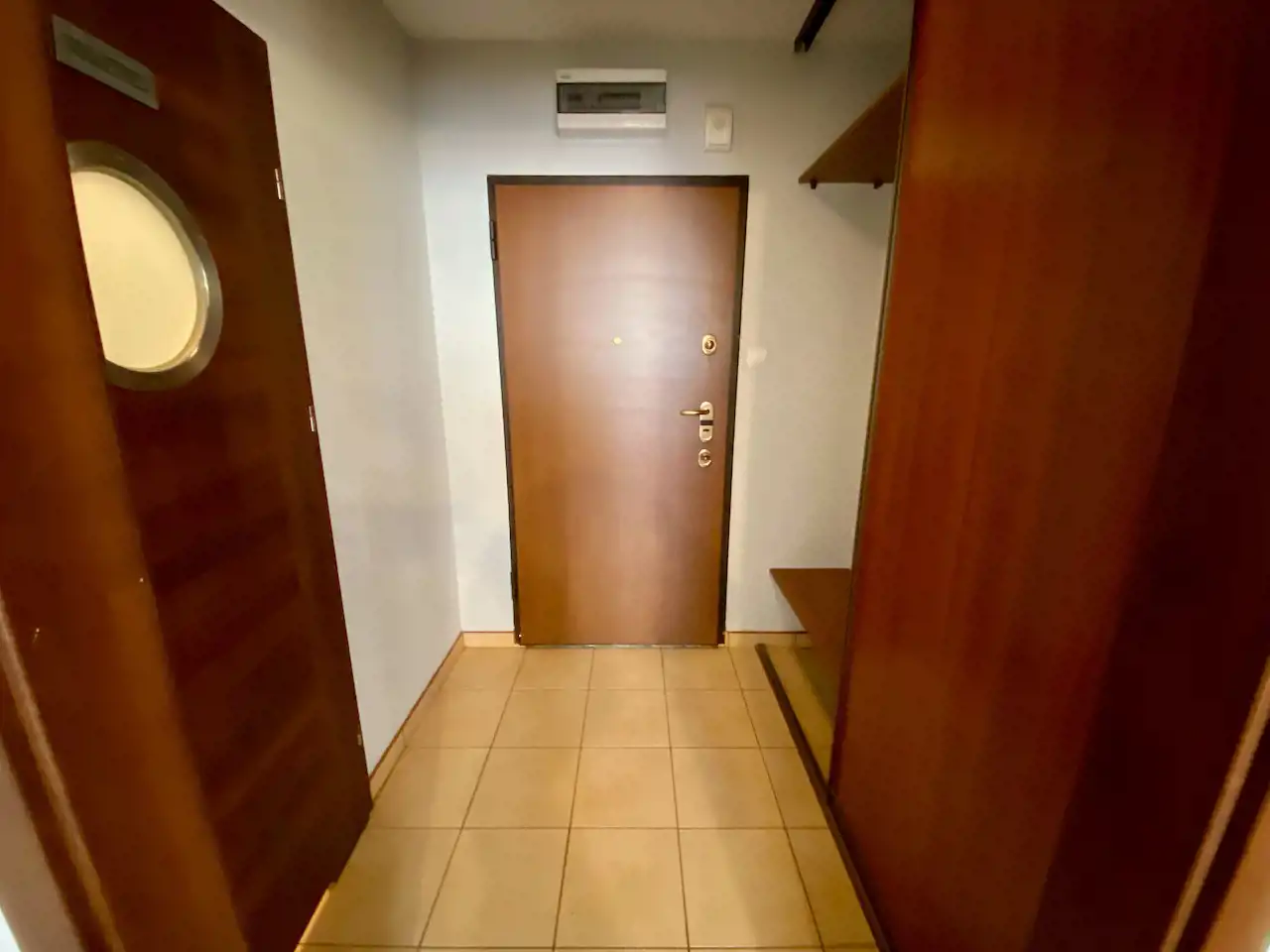 Pokój jest bardzo przestrony - ma około 22 mkw. Na podłodze egzotyczna deska, na ścianach gładzie, wyjście na balkon, okna na wschód. W kuchni meble pod wymiar, lodówka, kuchnia z płytą ceramiczną i piekarnikiem, ściany zabezpieczone szklanymi taflami. Łazienka z kabiną prysznicową, umywalką, szafkami i miejscem na pralkę. Hol z szafą pod wymiar.
