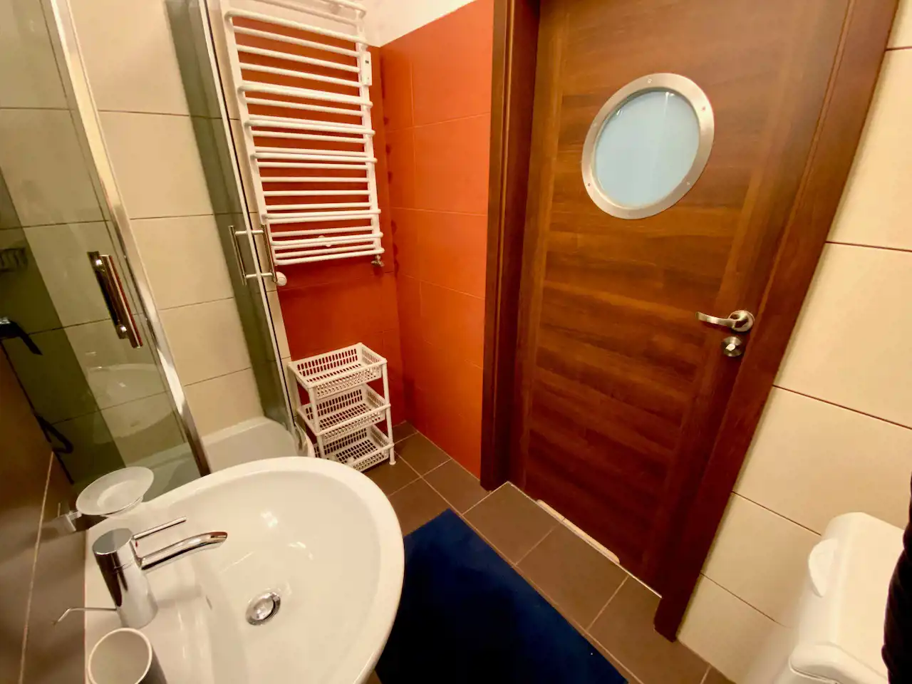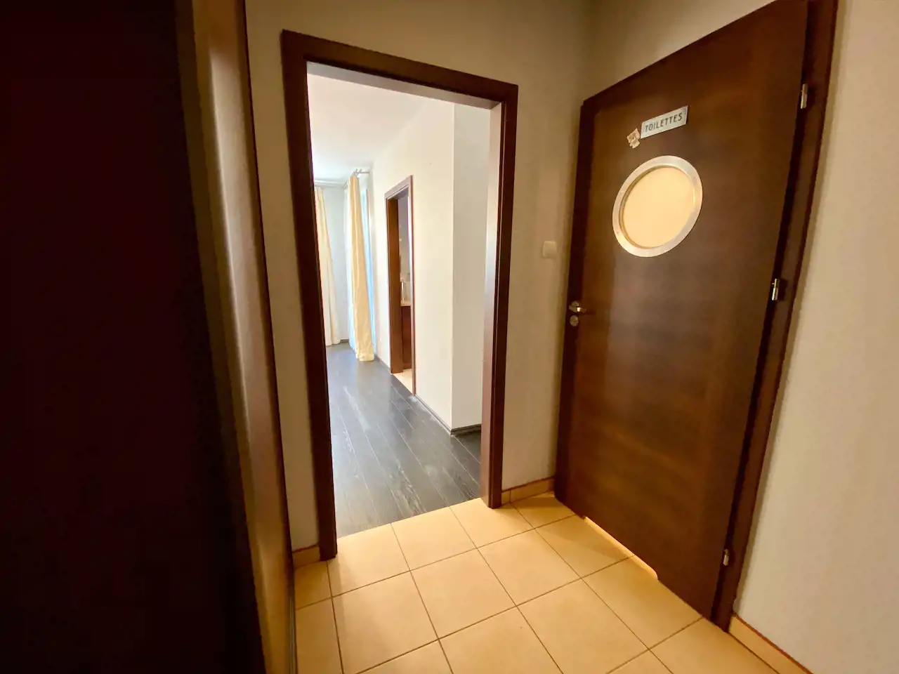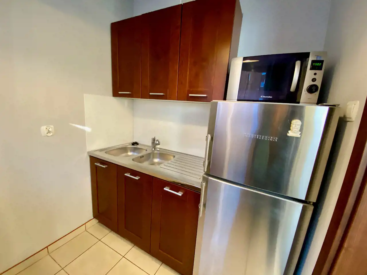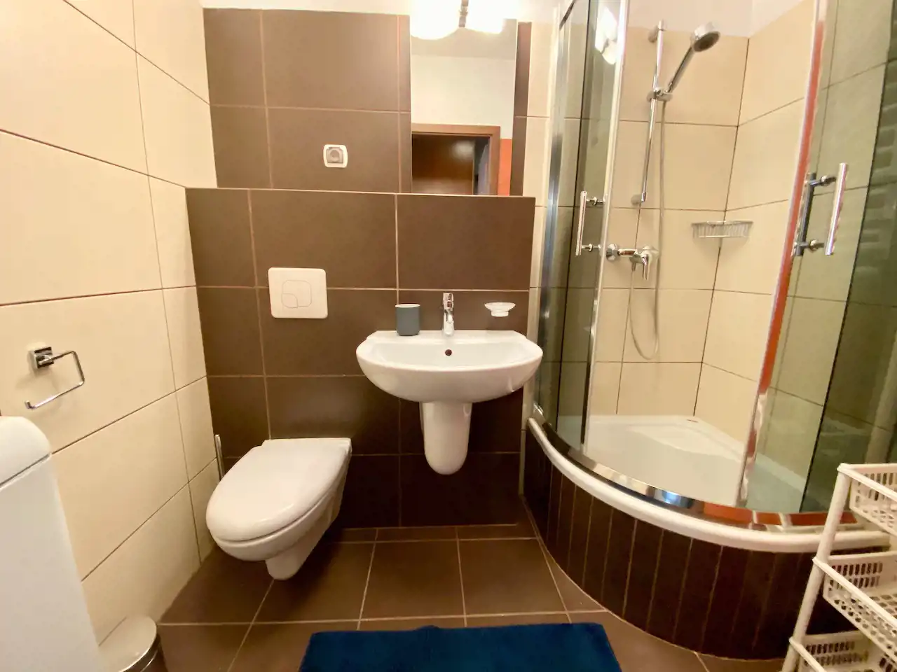 Pokój jest bardzo przestrony - ma około 22 mkw. Na podłodze egzotyczna deska, na ścianach gładzie, wyjście na balkon, okna na wschód. W kuchni meble pod wymiar, lodówka, kuchnia z płytą ceramiczną i piekarnikiem, ściany zabezpieczone szklanymi taflami. Łazienka z kabiną prysznicową, umywalką, szafkami i miejscem na pralkę. Hol z szafą pod wymiar.